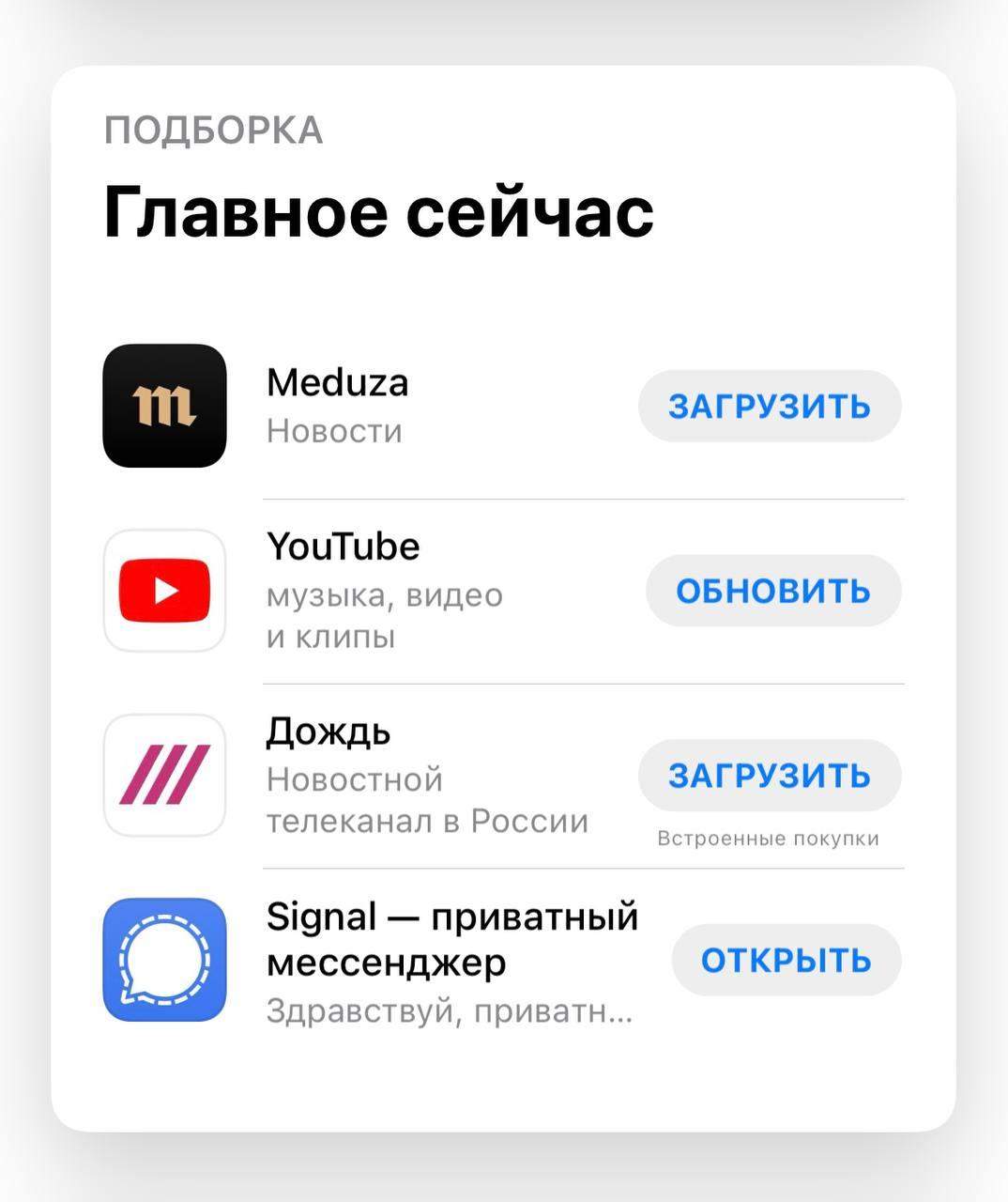 В подборке также приложения «Медузы», «Дождя», чей сайт вчера заблокировали из-за новостей о войне в Украине, а также YouTube и мессенджер Signal.