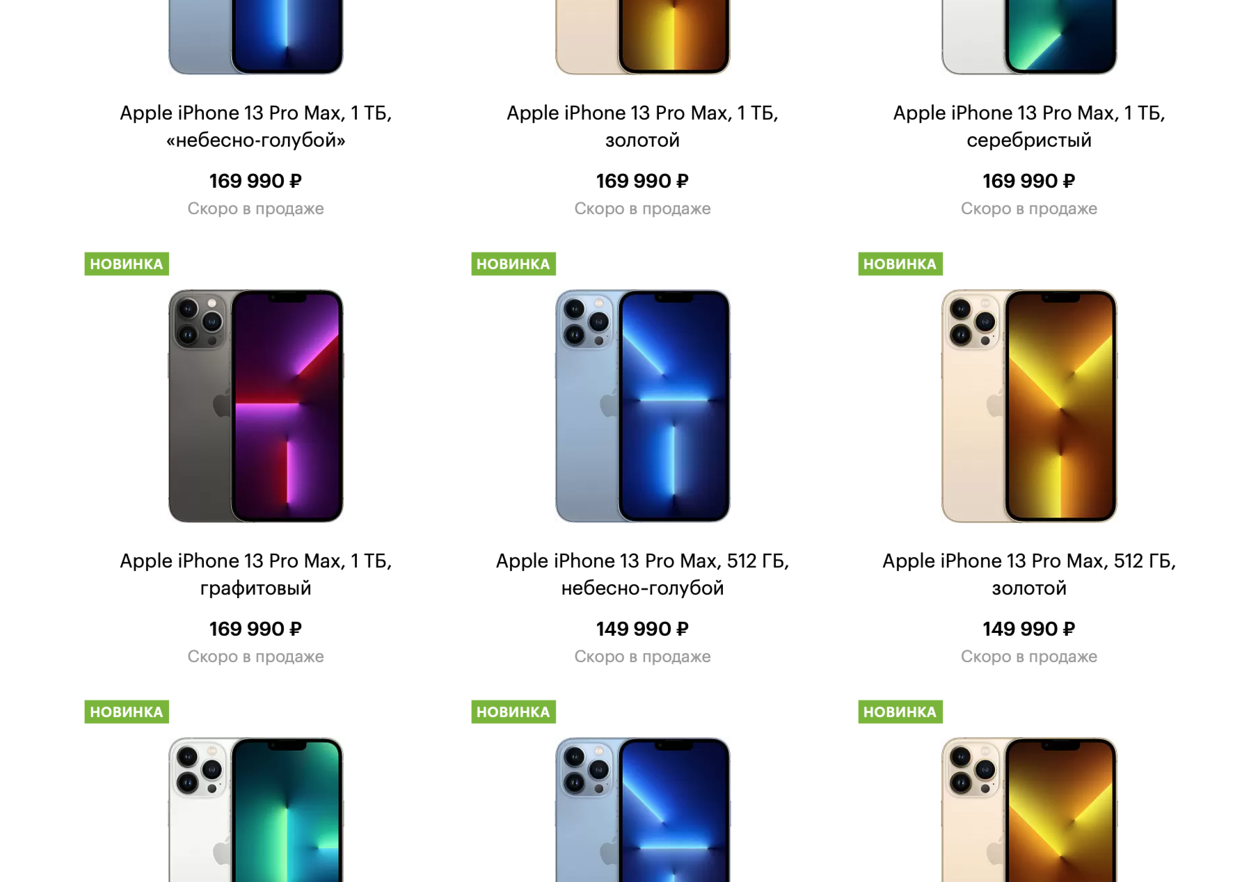 В онлайн-магазине сети re:Store, как убедилась «Бумага», сейчас нет доступных для покупки айфонов. Макбуки отображаются как недоступные для заказа в Петербурге (то же самое, если переключить регион на Москву).