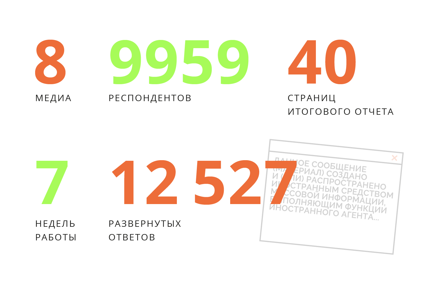 Чтобы ответить на эти вопросы, «Бумага» вместе с семью изданиями — «Медузой», «Медиазоной», «ОВД-Инфо», The Village, «Тайгой.Инфо», «Холодом» и «7×7» — провела социологическое исследование и опросила почти 10 тысяч человек.