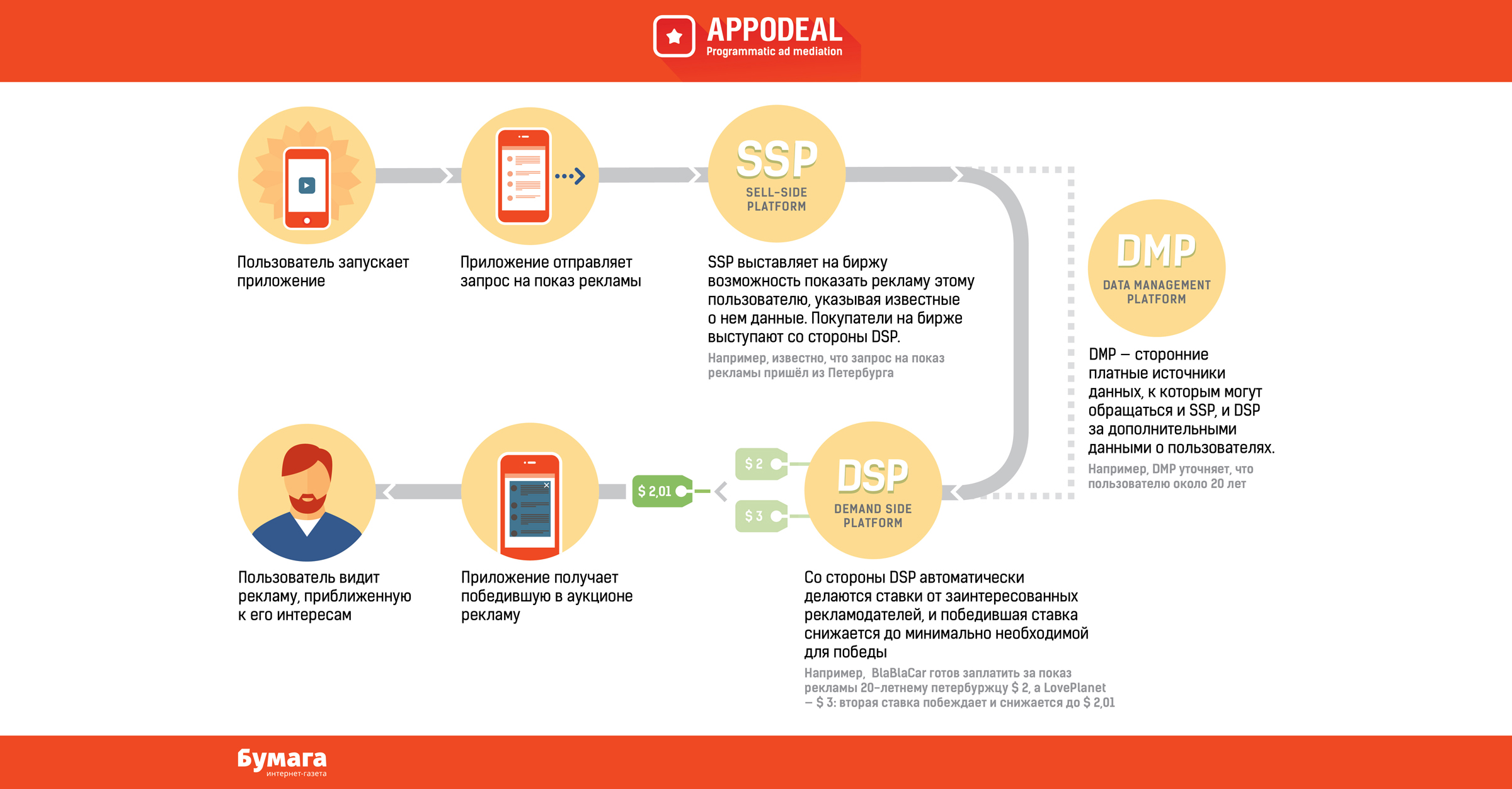 Она работает так: показ рекламы в каждом случае оказывается выставлен на аукцион. Когда пользователь запускает приложение, информация об этом попадает в систему. Она автоматически подбирает рекламодателя по трем параметрам: что известно о пользователе, подходит ли он рекламодателю и сколько заказчик готов заплатить за показ. Тот, кто делает самую большую ставку, и получает право показать.