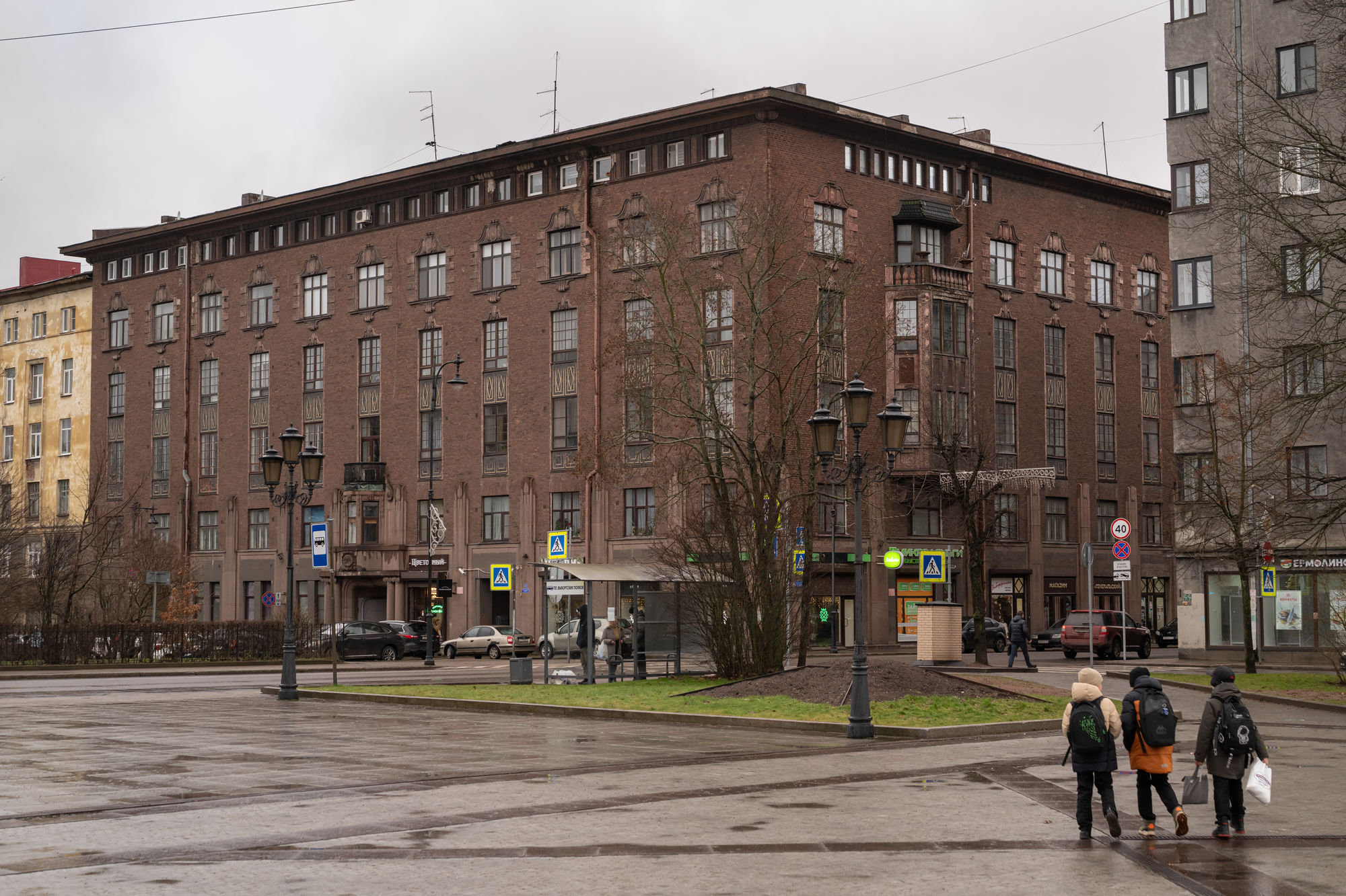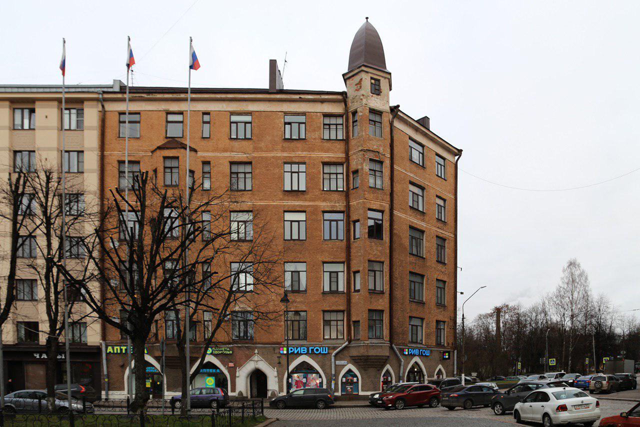 • Совсем рядом, на проспекте Ленина, 8а, обратите внимание на бывший дом Национального акционерного банка, сейчас внутри — квартиры. Чертежи здания составило бюро «Нюстрем-Петрелиус-Пенттиля», соорудили дом в 1901 году. Обратите внимание на герб Финляндии на фасаде и гранитный паровоз.