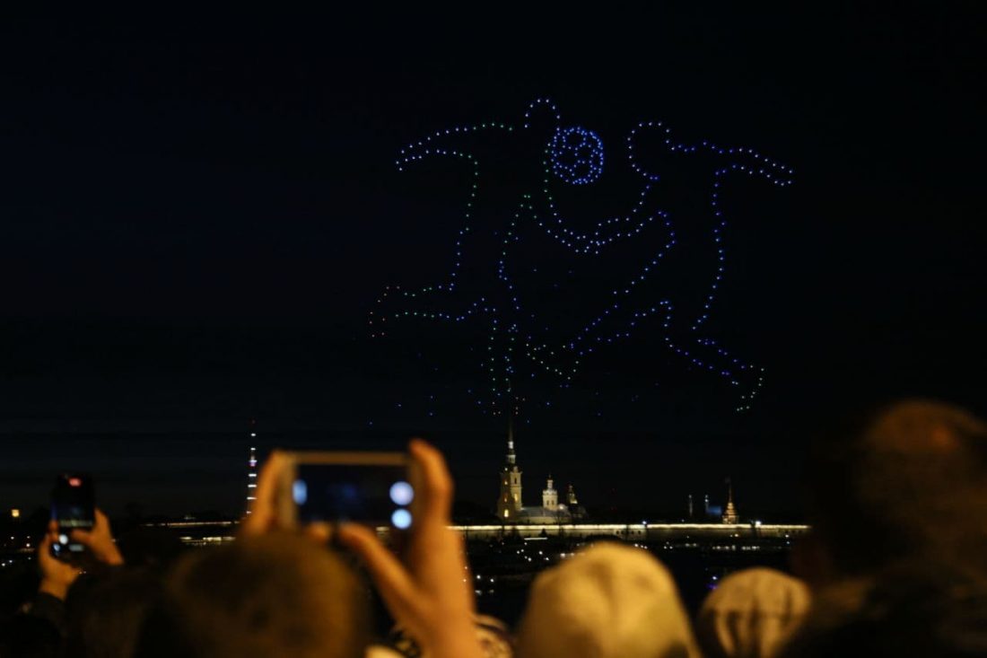А во время открытия всероссийского туристического сезона на шоу дронов вспомнили про футбол. В небе над Невой появились силуэты двух игроков.