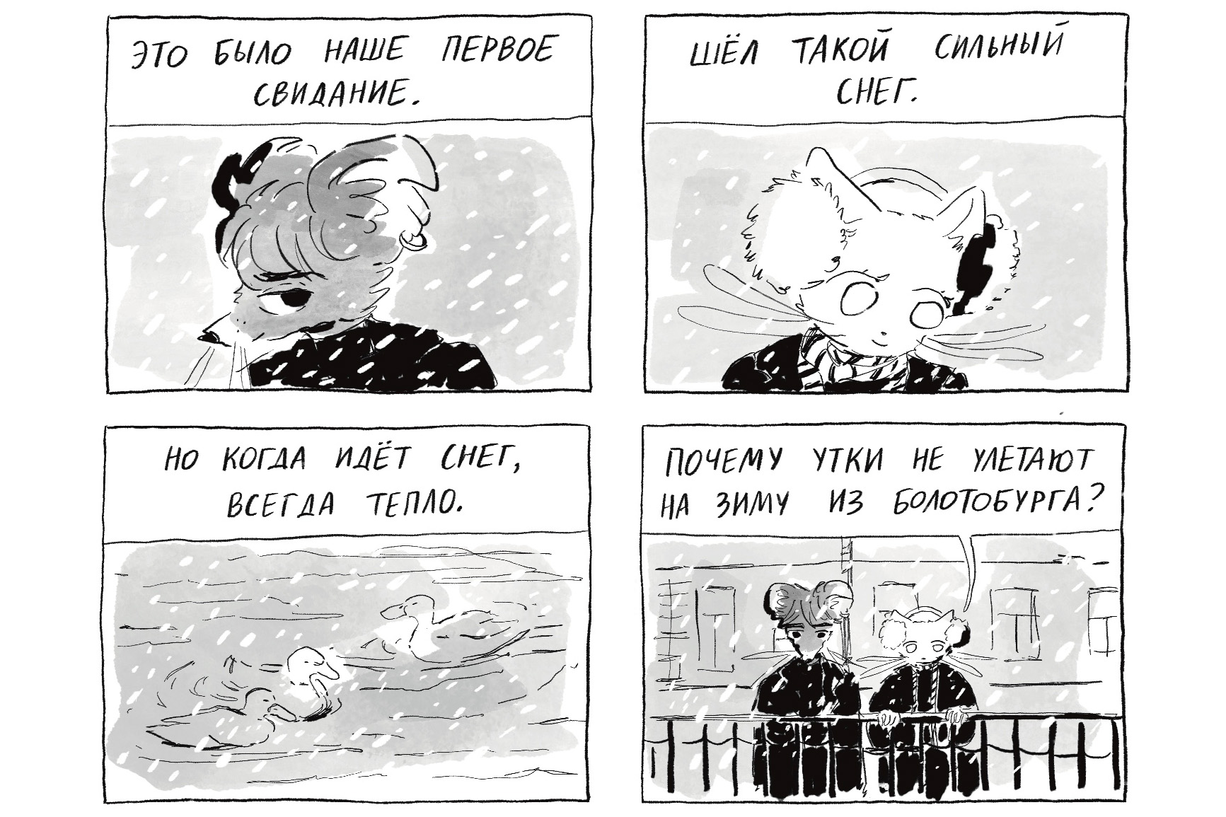 Три года назад новосибирская художница и иллюстраторка Лиза Влас переехала в Петербург. А потом выпустила комикс «23». В нем Киса, Собаня, Крыс и другие антропоморфные животные проживают (и взрослеют) в Болотобурге — городе с прекрасной архитектурой, но ужасным климатом.