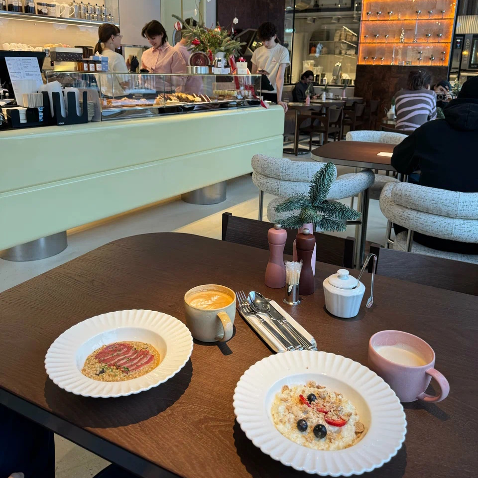 Завтраки подают до 13:00 — заказать можно индийские лепешки роти с лососем (750 рублей), томатную овсянку с яйцом пашот (550 рублей) и другие небанальные блюда. В основном меню найдутся парижский шницель с каперсами и паста орекьетте с кроликом (оба блюда — 950 рублей), а в десертную карту включили как пирожные, так и целые торты (например, «Наполеон» обойдется в 2 700 рублей).