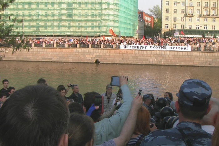 6 мая всё началось с очень красивого парада в яркий солнечный день. Но официальная часть закончилась, петербургская колонна закрепилась на мосту, не доходя Болотной, а я с парой своих знакомых решила посмотреть, чем занимаются остальные участники марша. Мы стали двигаться на шум, в направлении основного скопления народа — в сторону кинотеатра «Ударник». Чем ближе мы подходили к месту, тем гуще становилась толпа. В какой-то момент пробираться дальше стало невозможно — люди стояли уже вплотную друг к другу. Образовалась какая-то пробка. Никто из людей в непосредственной близости от нас не знал доподлинно — почему.