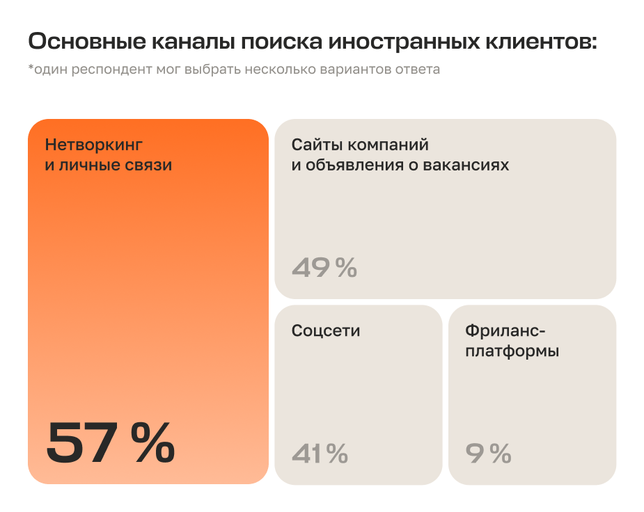 Почти половина участников исследования (49 %) находят работу или клиентов через сайты компаний и объявления о вакансиях. Еще 41 % респондентов используют для этого личные связи: например, публикуют посты о поиске работы на своих страницах в соцсетях. Фриланс-платформы — наименее популярный способ поиска зарубежных заказчиков. Только 9 % опрошенных рассказали, что используют их.