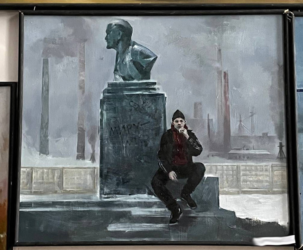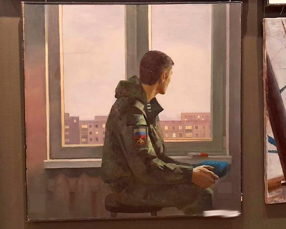 Большинство выбрало тему войны. Например, на одной из выставленных работ изображен курящий мужчина, который сидит у памятника Ленину на фоне индустриального города.