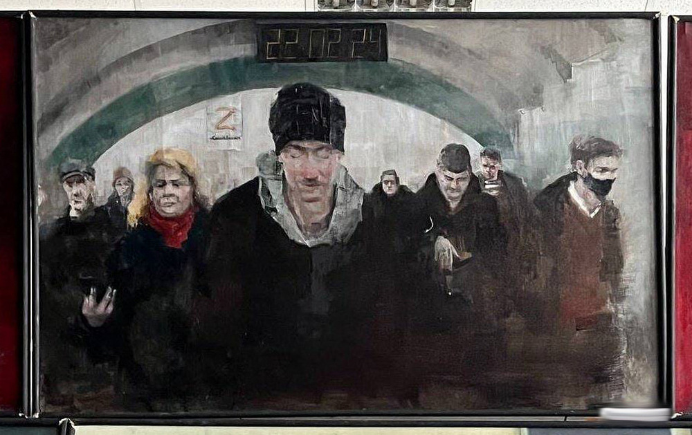 Студенты петербургской Академии художеств имени Ильи Репина выставили в учреждении картины, в которых отразили свое восприятие войны. На полотнах — жены погибших военных, телевизионная пропаганда и добровольцы, отправляющиеся на фронт.