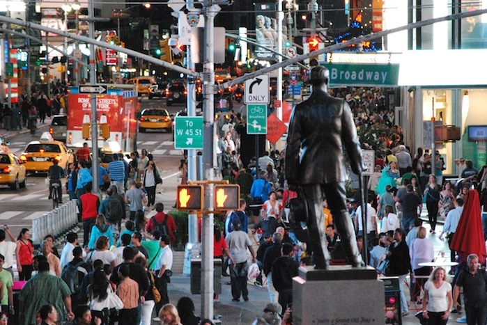 «Хорошо сесть после долгого дня на знаменитые красные ступеньки на Тайм-сквер, затянуться сигаретой, обжечь язык первым глотком американского кофе, завести разговор с людьми, которые могут оказаться из любого уголка света, и на какой-то момент понять — ты в Нью-Йорке»