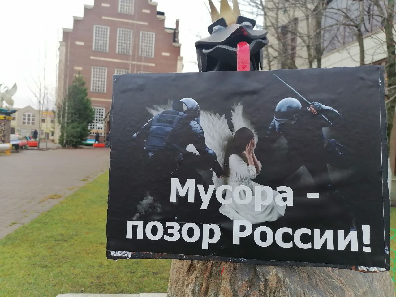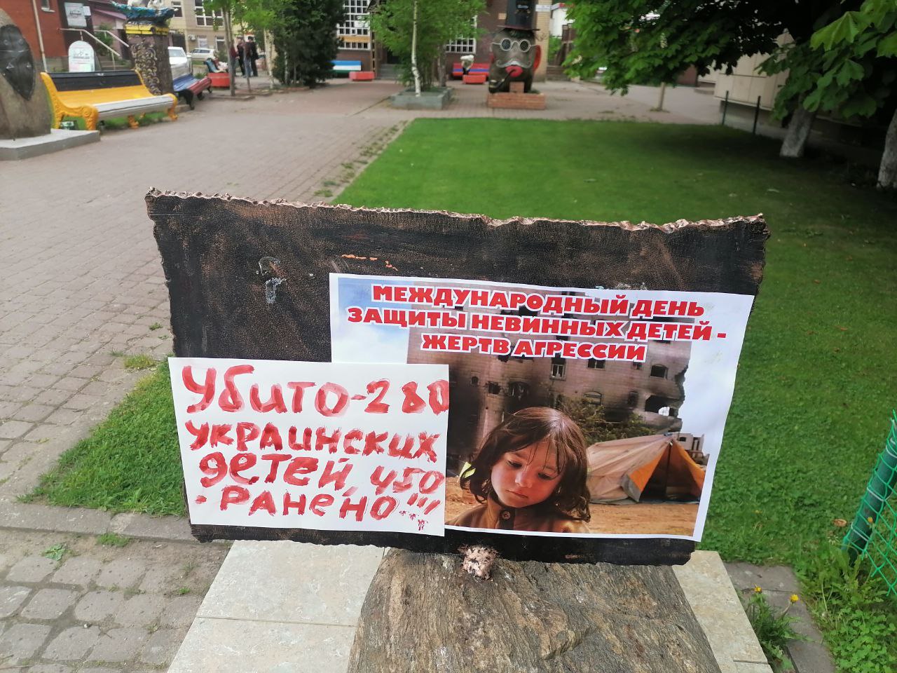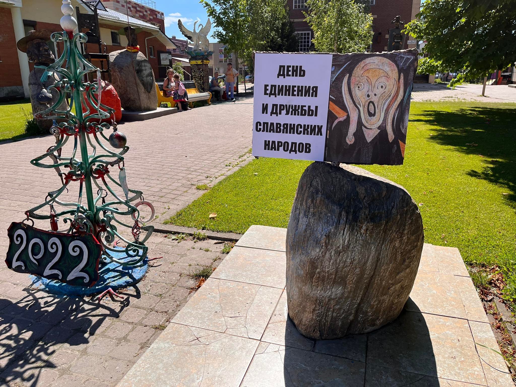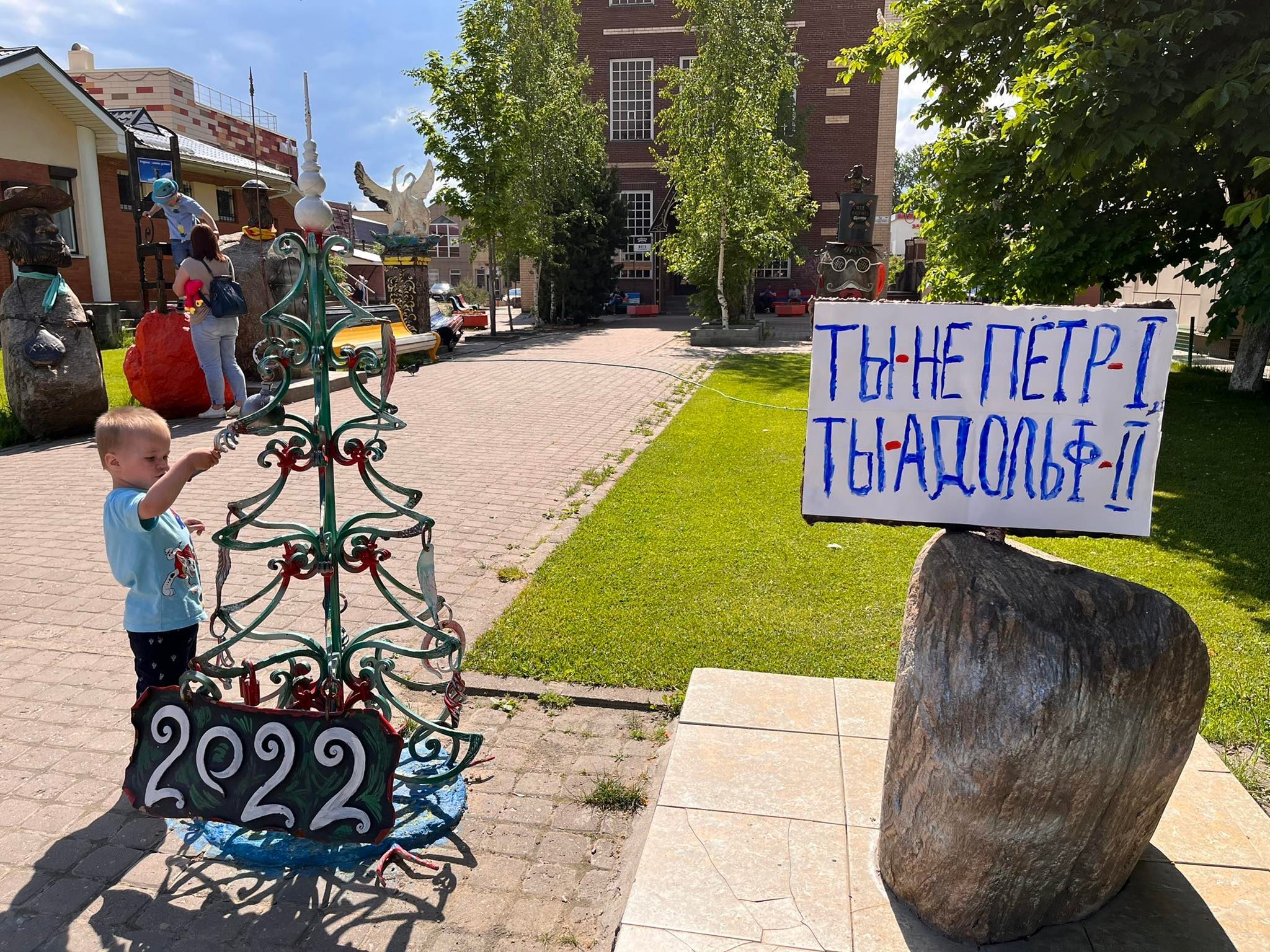 Но и тогда Правдин продолжил вешать таблички с высказываниями и картинками прямо на камне. В мае 2022-го там висел плакат «Нет фашизму». В День Победы Александр прикрепил на камень табличку «Рашисты» — рассказывает, что его чуть не побили, за него вступились женщины, и он «остался живой».