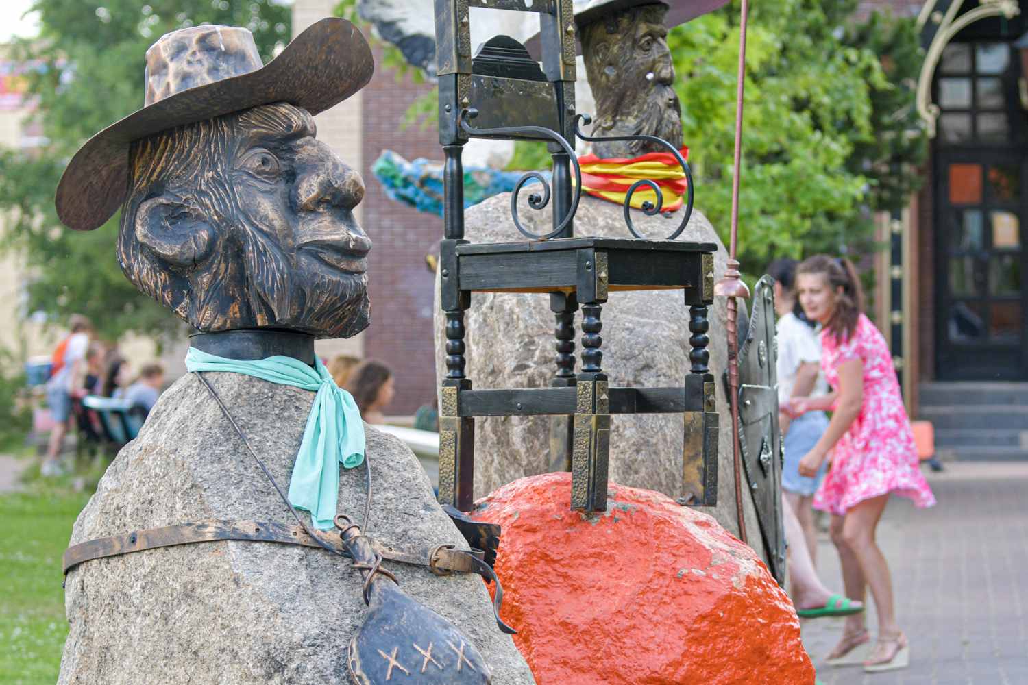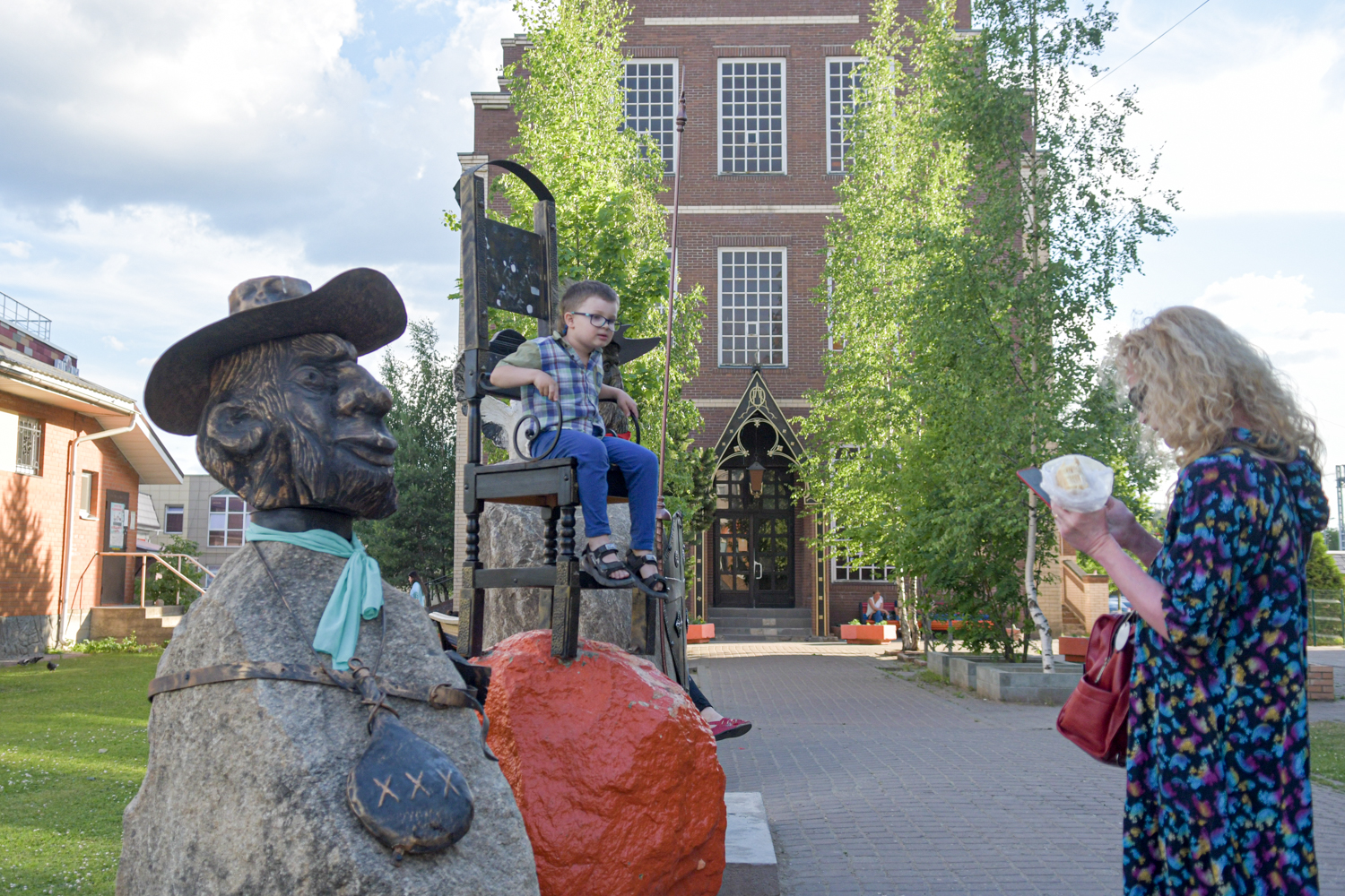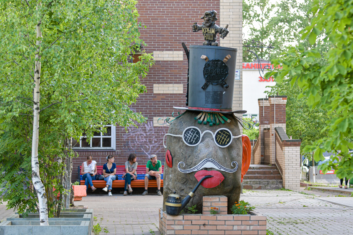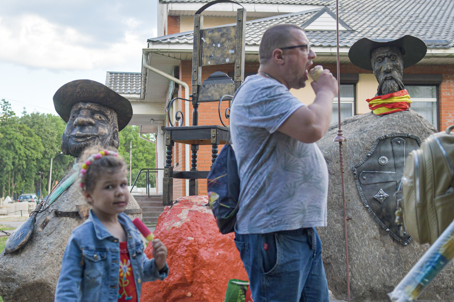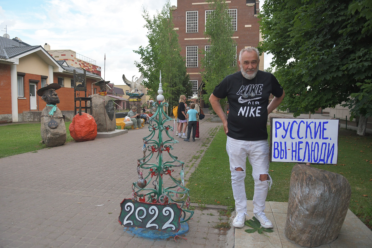 На пятачке перед голландским домом Александр устроил сквер со скамейками и скульптурами авторства местных жителей. Это голландская мельница, статуя с аистами, валун в виде головы с курительной трубкой, в шляпе-цилиндре. На ней — фигурка человечка с безумными глазами и с бутылкой водки. На пузе у человечка — гравировка: «Крым наш». А на самом цилиндре — железная табличка с замазанной надписью «Нет войне». Александр поясняет: ее установили еще в 2014 году, когда партия «Яблоко» высказалась против войны в Украине. Недавно на табличке нарисовали букву Z, которую Правдин стер.