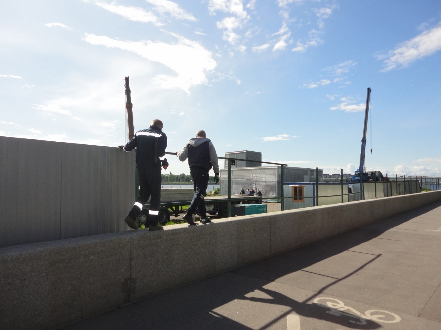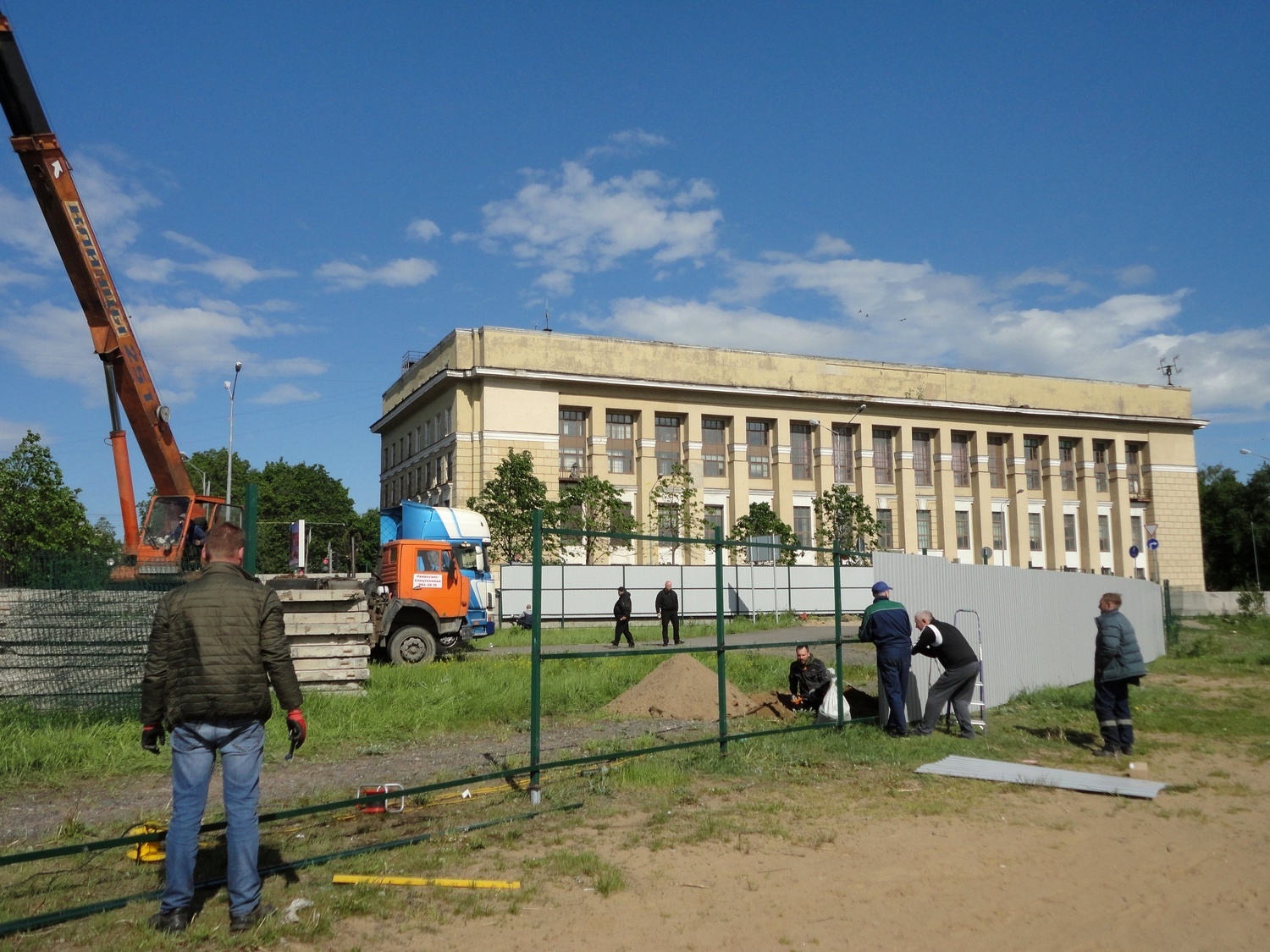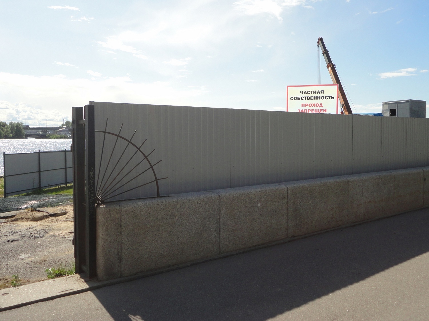 Забор из железного профиля и информационный щит на невском полуострове в МО «Малая Охта» появились 27 мая. До этого часть территории была ограждена сеткой. В начале июня сюда пригнали краны, привезли бетонные плиты и сваи, установили бытовки для строителей. На участке заработали экскаваторы. При этом прибрежная часть полуострова открыта для прогулок, убедился корреспондент «Бумаги».