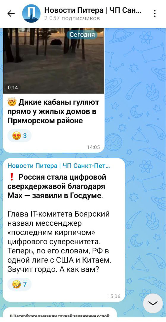 — Помимо крупных каналов, некоторые из которых перешли в Мах, обычный пользователь подписан на множество мелких — дружеских, профильных, с мемами. Такая система каналов в телеграме складывалась годами, и просто так вырастить ее в Мах по указанию сверху невозможно, особенно учитывая цензуру и вертикальное администрирование, — говорит он «Бумаге».