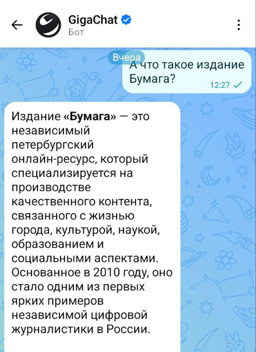 Как и в телеграме, в Max можно читать каналы, переписываться и звонить, отправлять голосовые сообщения и видео-«кружочки». Еще одна скопированная опция — возможность создавать чат-ботов. В мессенджер также интегрирована нейросеть «Сбера» GigaChat. Ранее она рекомендовала читать издания-«иноагенты», но затем ИИ починили — сейчас в свои подборки независимых медиа о Петербурге GigaChat не включает, например, «Бумагу».