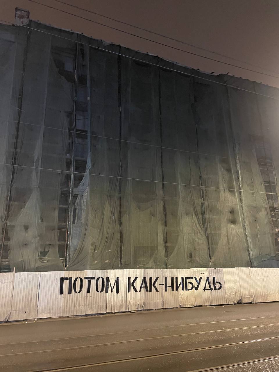 — Посыл у каждой работы свой. В последнее время больше работ делаю на временных строительных заграждениях. Мне очень понравилось работать на фасадной сетке. С одной стороны, это привлекает внимание, что здание стоит обтянутое сеткой, и не факт, что о нем в ближайшее время вспомнят. Один посыл такой. А второй посыл — графический, текстовый, информационный. И когда эти посылы сочетаются — это допустимое поле в рамках современного административного и уголовного законодательства. Памятники я, естественно, не трогаю, свежеотреставрированные дома и поверхности тоже. А если стена уже запачкана, кто-то накалякал, начирикал, какие-то глупости написал, то почему бы сверху не сделать что-то красивое?
