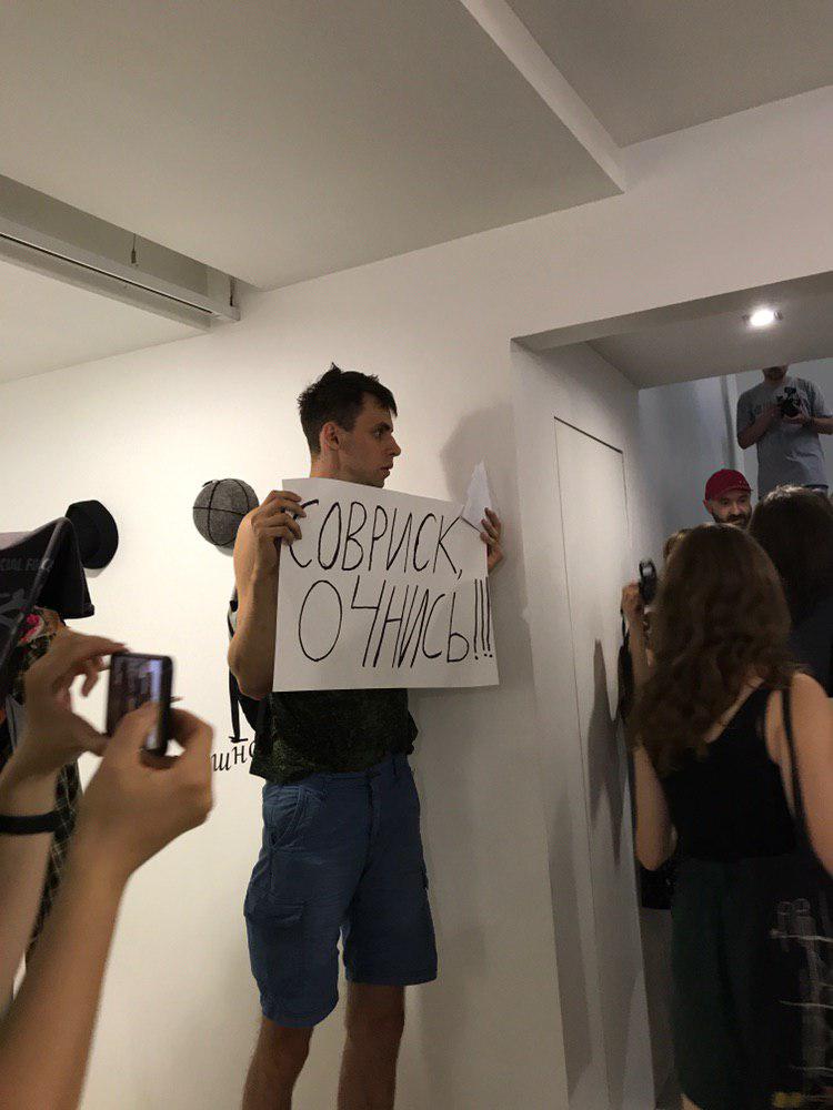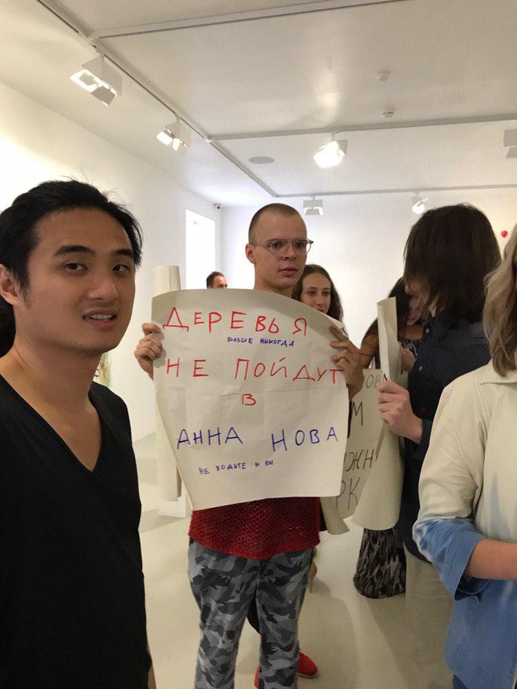 Активисты пришли в галерею с плакатами «Анна Нова без дуболомства, полюбим снова», «Деревья больше никогда не пойдут в Анна Нова, не ходите и вы», а также «Анна Нова — нет стройке».