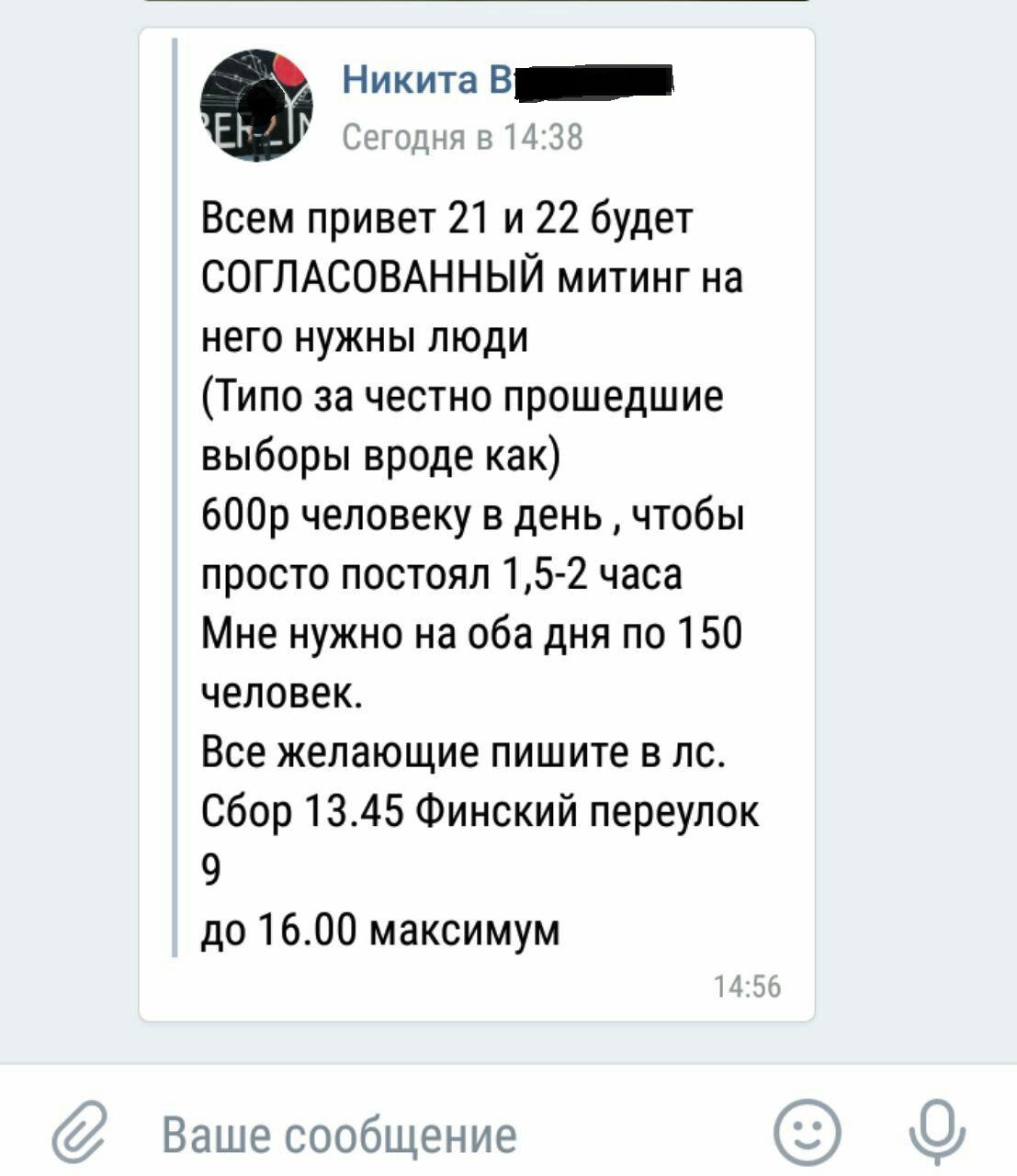 В соцсетях петербуржцам предлагают за 600 рублей прийти на митинги «за честно прошедшие выборы» 21 и 22 сентября. Сообщения рассылает во «ВКонтакте» Никита В., местом работы которого указана компания по организации праздников.
