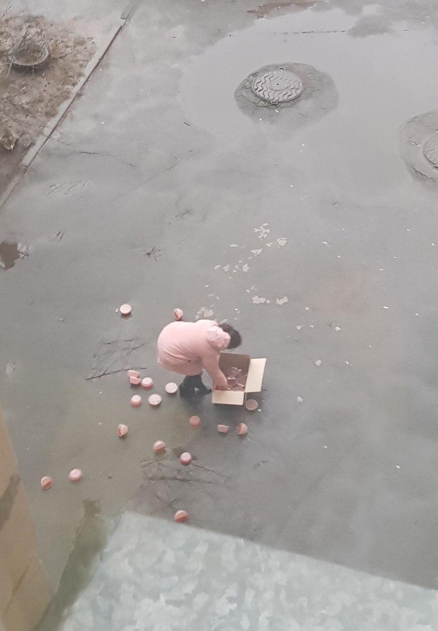 Кроме того, по словам студентки, во время разгрузки перед крыльцом между 6 и 7 секциями коробки с едой уронили, из-за чего часть контейнеров выкатилась на асфальт, а часть — пролилась. Потом еду собрали обратно.