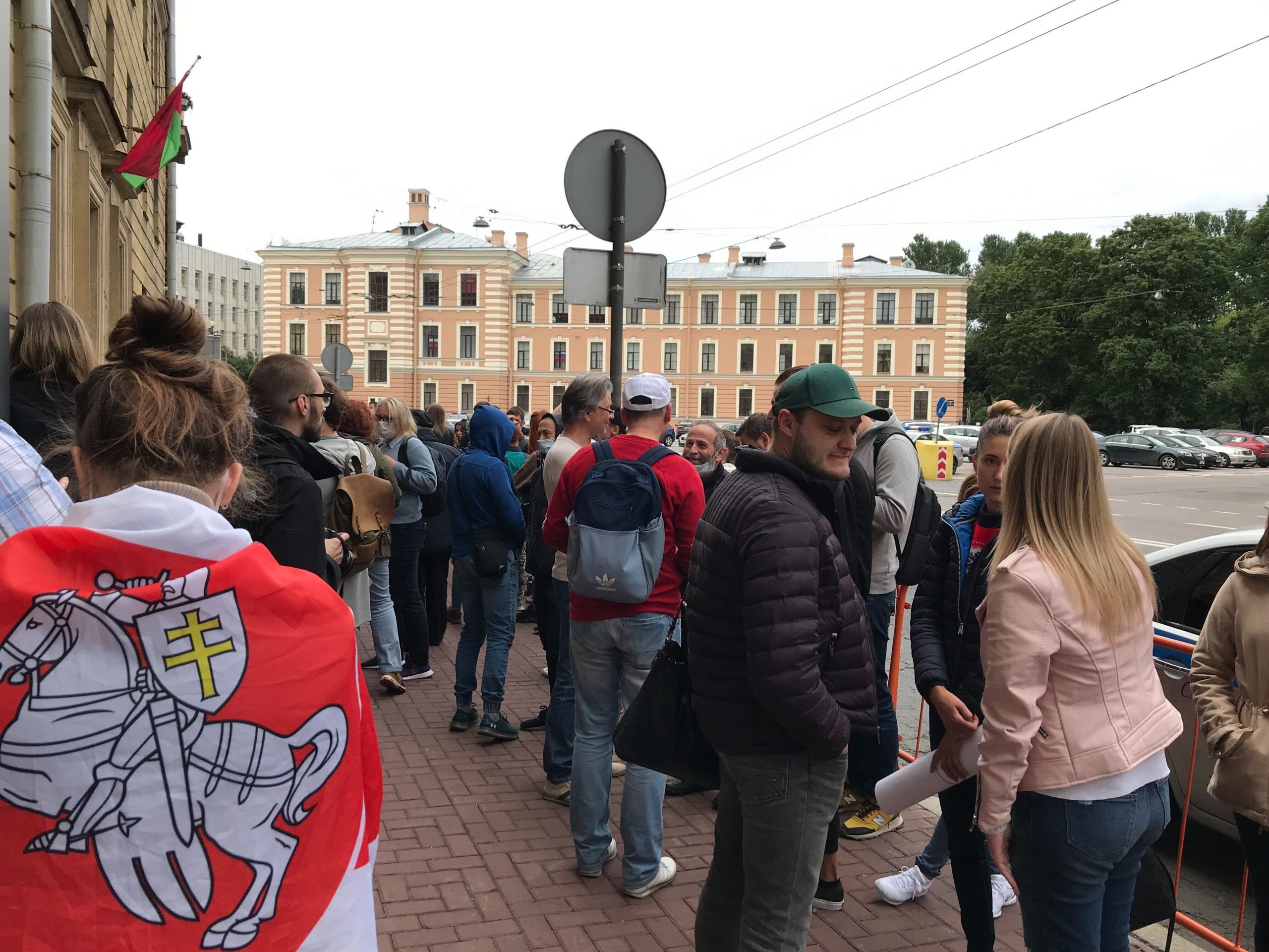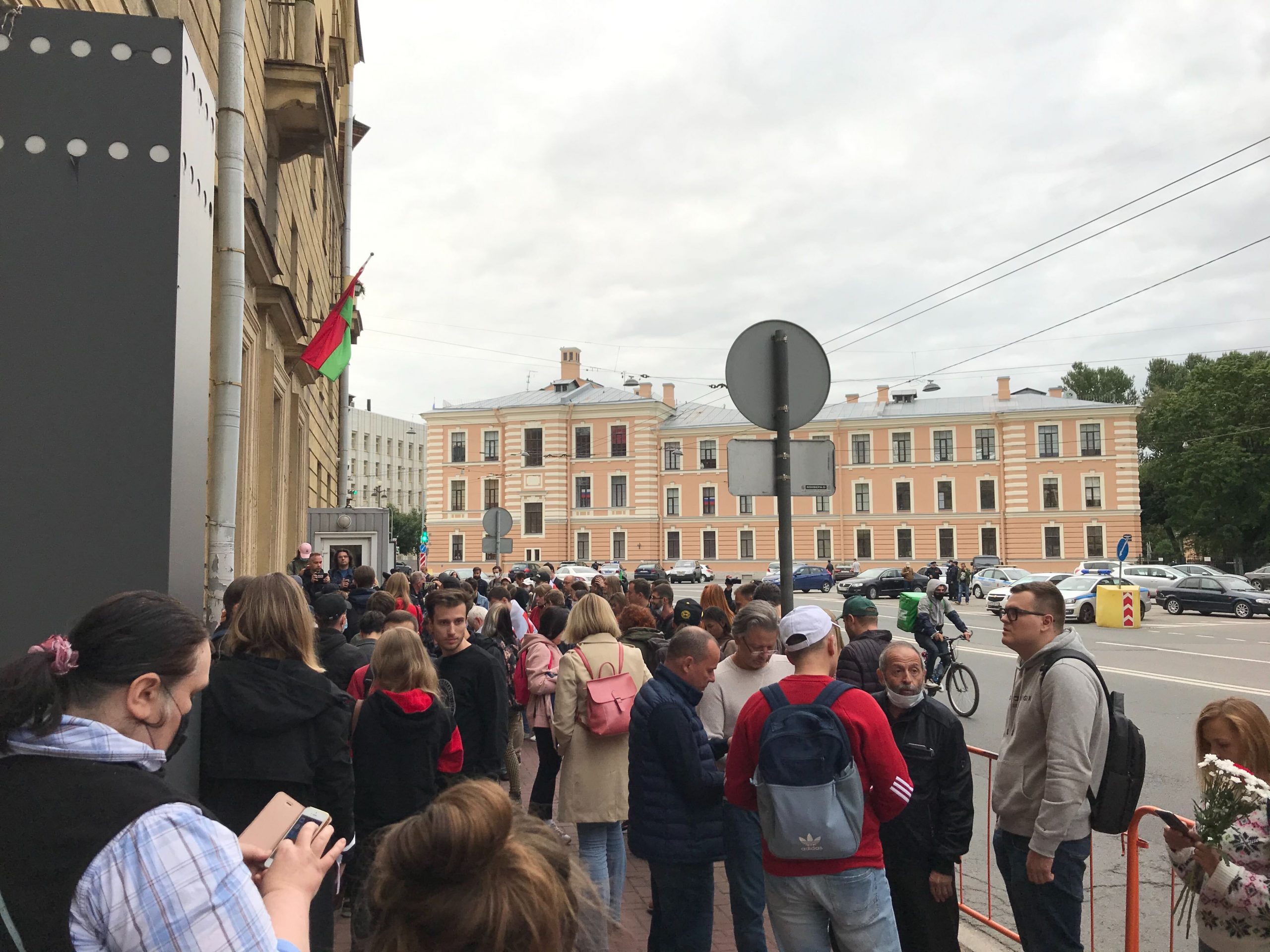 Вечером 11 августа у отделения посольства Беларуси в Петербурге прошла акция солидарности с протестующими в Беларуси. Туда пришли сотни человек. «Бумага» показывала снимки с акции.