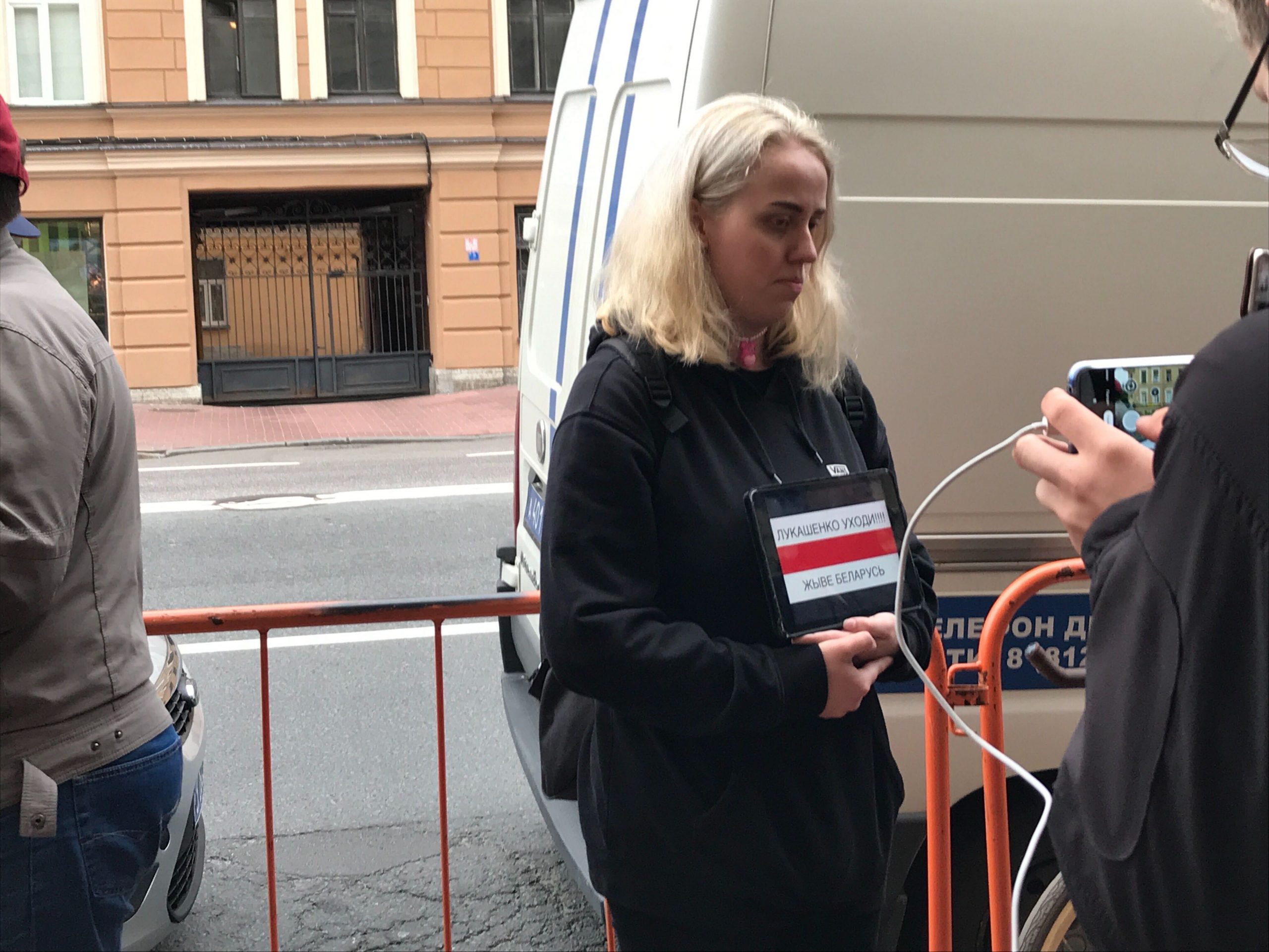 «Северо-Запад. МБХ медиа» пишет, что полицейские помогают закрашивать активистам оскорбительные лозунги. «Беларусь будет свободна — это пожалуйста. А вот мразь, крыса и убийца — не надо. Вы же петербурженки. Не стоит так», — цитирует издание сотрудника МВД.