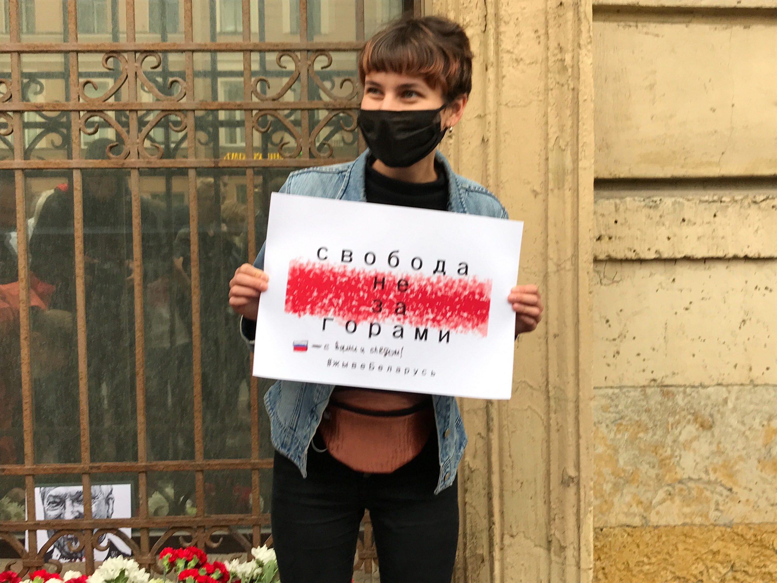 Петербуржцы вышли к отделению с плакатами «Перестаньте убивать и калечить», «Белоруссия. Россия с тобой! Долой Лукашенко! Остановите насилие!», «Выборы не должны быть захватом власти», а также «По заслугам получит усатая **** и каждый его вшивый пес».