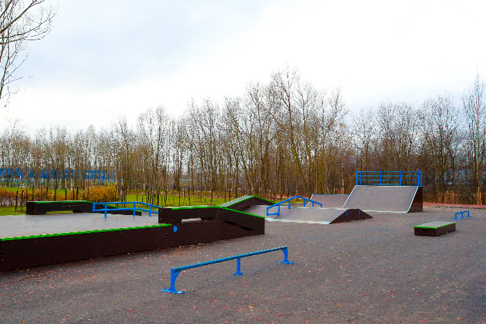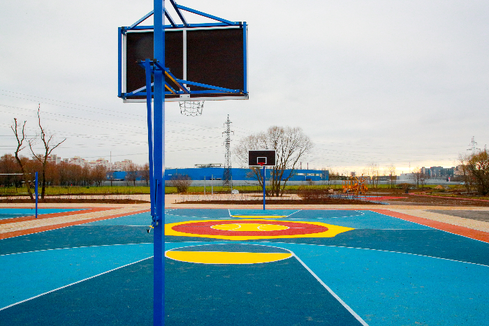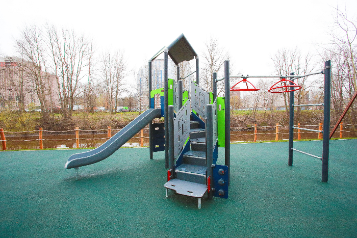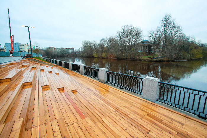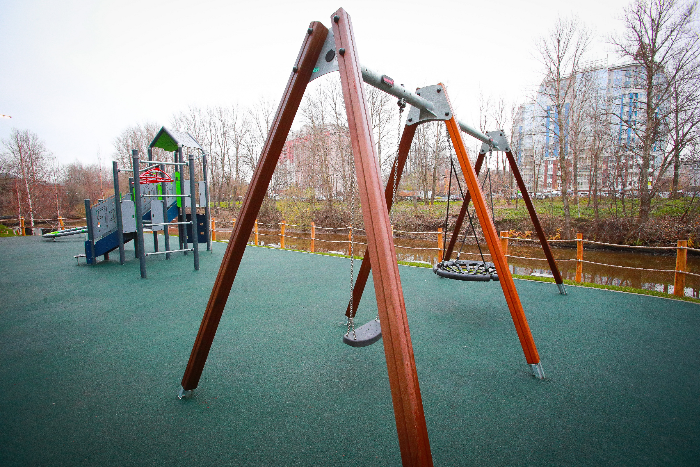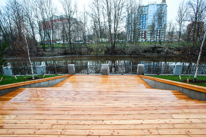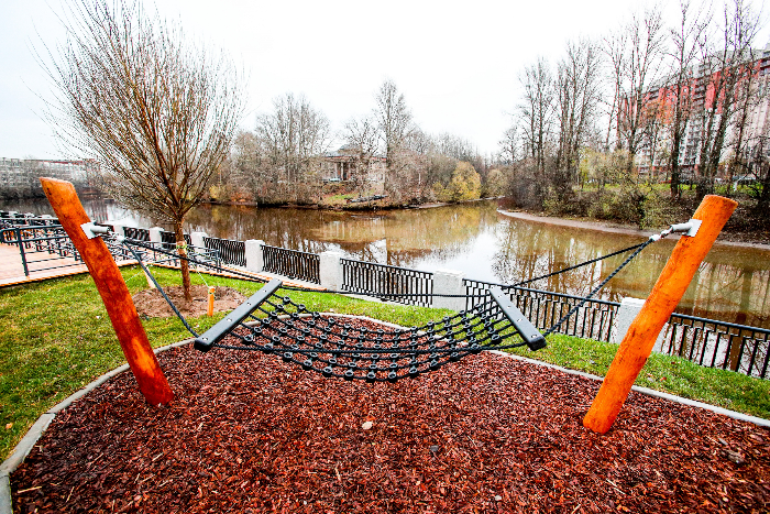 На территории общественных пространств разместили детские площадки, деревянный амфитеатр, гамаки с видом на реку Охту, площадку для игры в баскетбол, уличные тренажеры и скейт-парк.