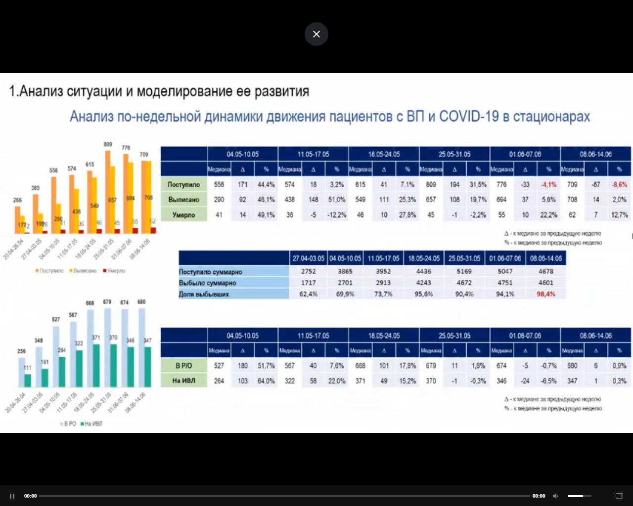 — Мы не только вышли на плато, но и, хочу сказать с осторожным оптимизмом, стали решать эту проблему, проблема становится не такой острой. Остается сложность не столько COVID, сколько сочетания внебольничной пневмонии и COVID-инфекции; но и здесь мы видим снижение понедельное: в предыдущую неделю — 4 %, в последнюю неделю — 8 %. И мы сейчас уже не имеем в начале 8, даже 7. Мы имеем значительное снижение количества поступающих больных; и что отрадно, мы увеличиваем количество выбывших больных. Фактически эти цифры сегодня сравнялись.