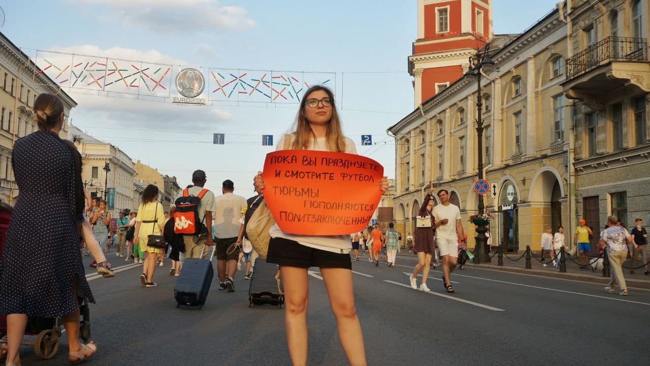 Активистки Евгения Сметанкина и Мария Ширяева вышли на Невский с плакатами: «Пока вы празднуете и смотрите футбол, тюрьмы пополняются политзаключенными» и «Я не жду принца на „Алых парусах“ — я жду, когда выпустят всех политзаключенных». Рядом с Думской улицей их задержала полиция, девушек увезли в отдел № 28.