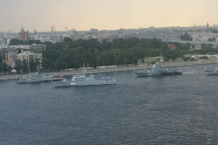 На видео заметно, что бортовой номер одного из кораблей — 507. По данным Минобороны, такой номер носит базовый тральщик соединения кораблей охраны Балтийского флота «Александр Обухов». ТАСС писал, что этот корабль участвует в свободной тренировке перед парадом ко Дню ВМФ в Неве.