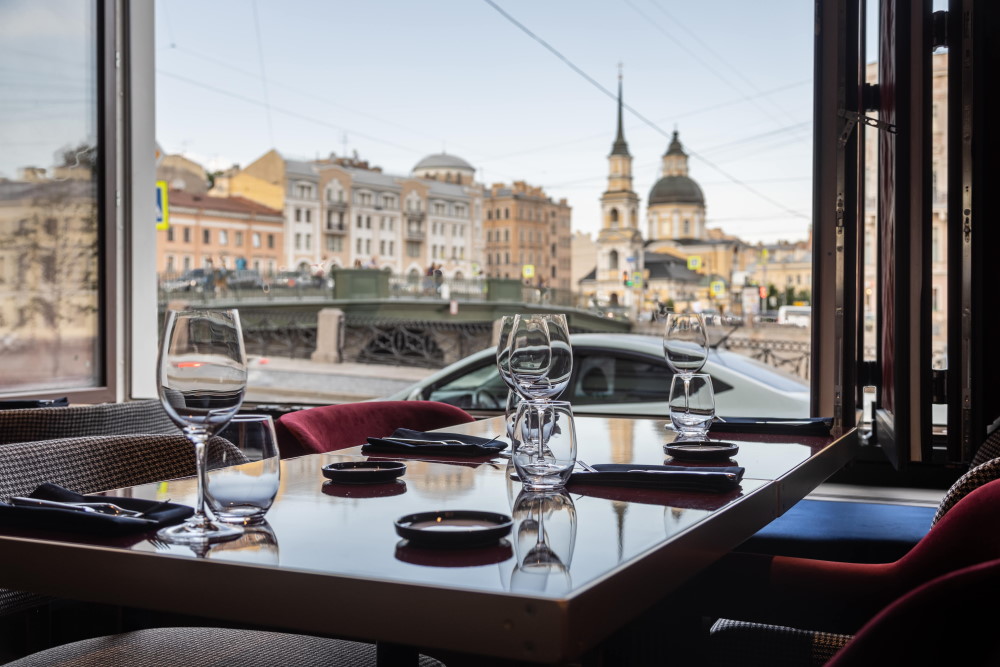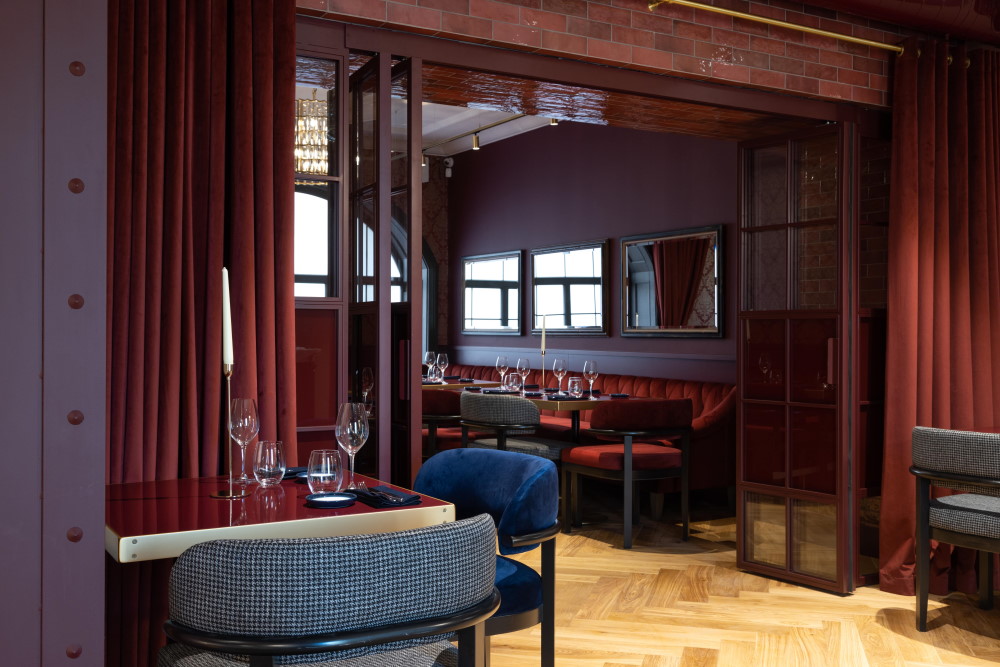 Ресторан находится напротив цирка, из панорамных окон открывается вид на соседнее здание. В заведении несколько залов, в каждом использовали свою цветовую гамму: от бело-бордовой до зеркально-синей. Дизайнер Евгений Танцурин использовал зеркала и натуральное дерево.