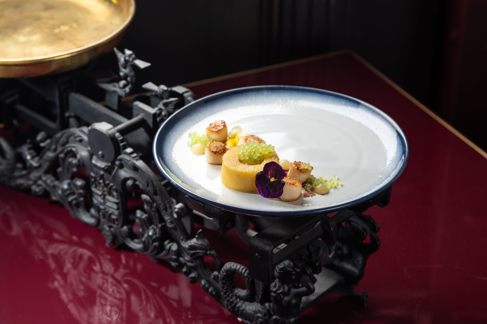 Гребешок с томленым яблоком, винной карамелью и икрой из лайма — 720 ₽