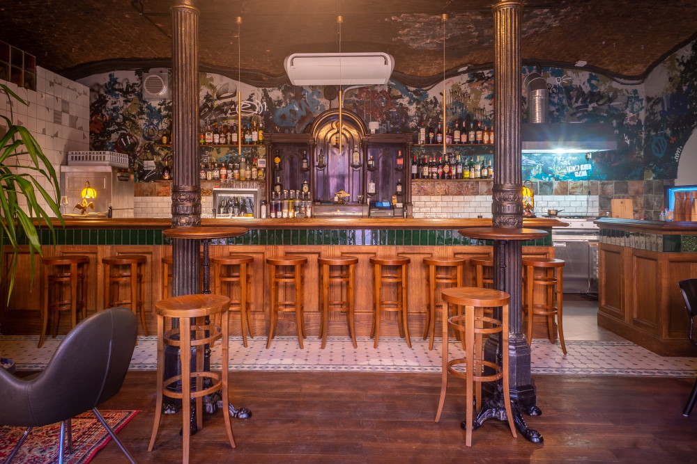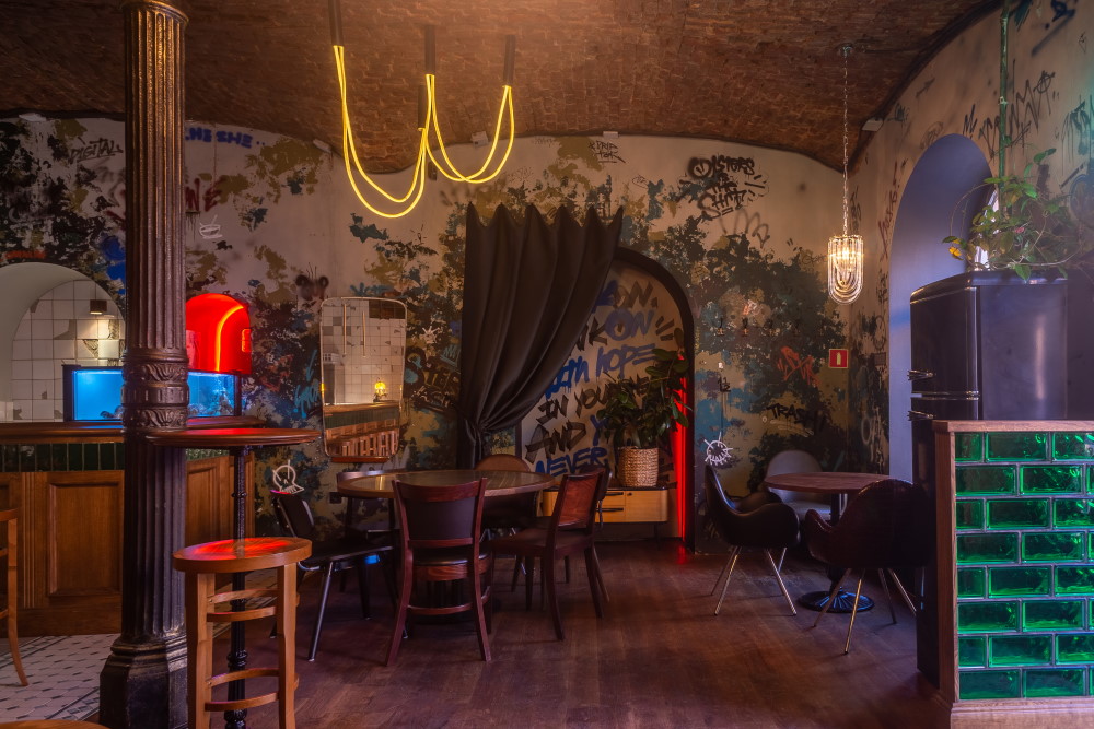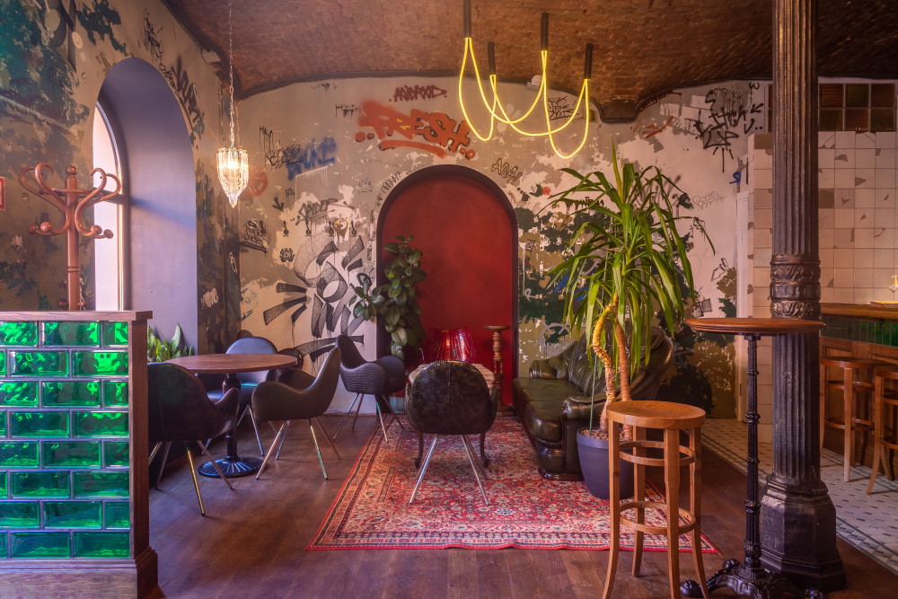 Помещение оформила Майя Габиддулина. Она вдохновлялась стилистикой берлинских лофтов: в зале выставили винтажную мебель, сводчатые потолки дополнили деревянными элементами, а стены расписали.