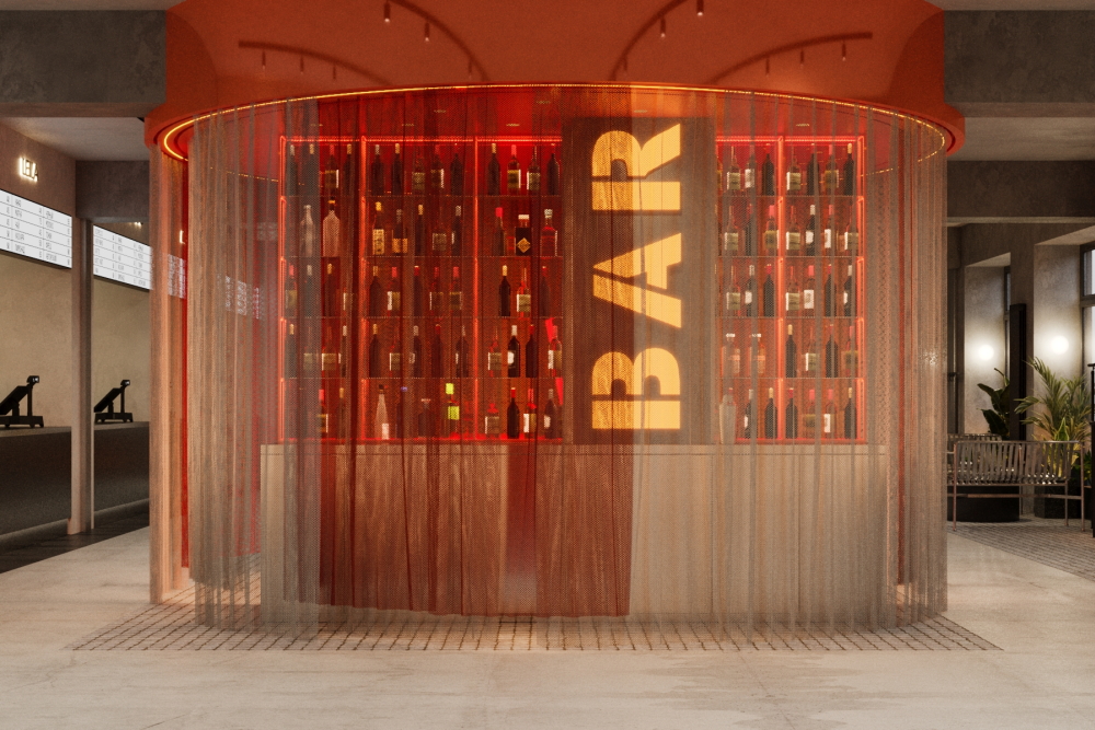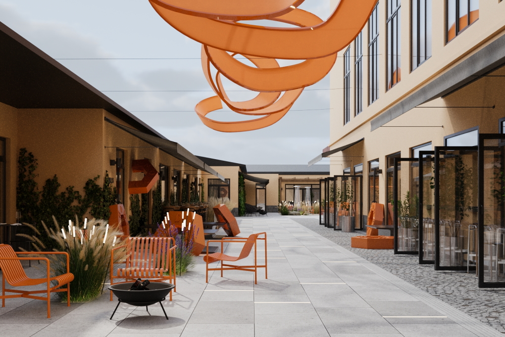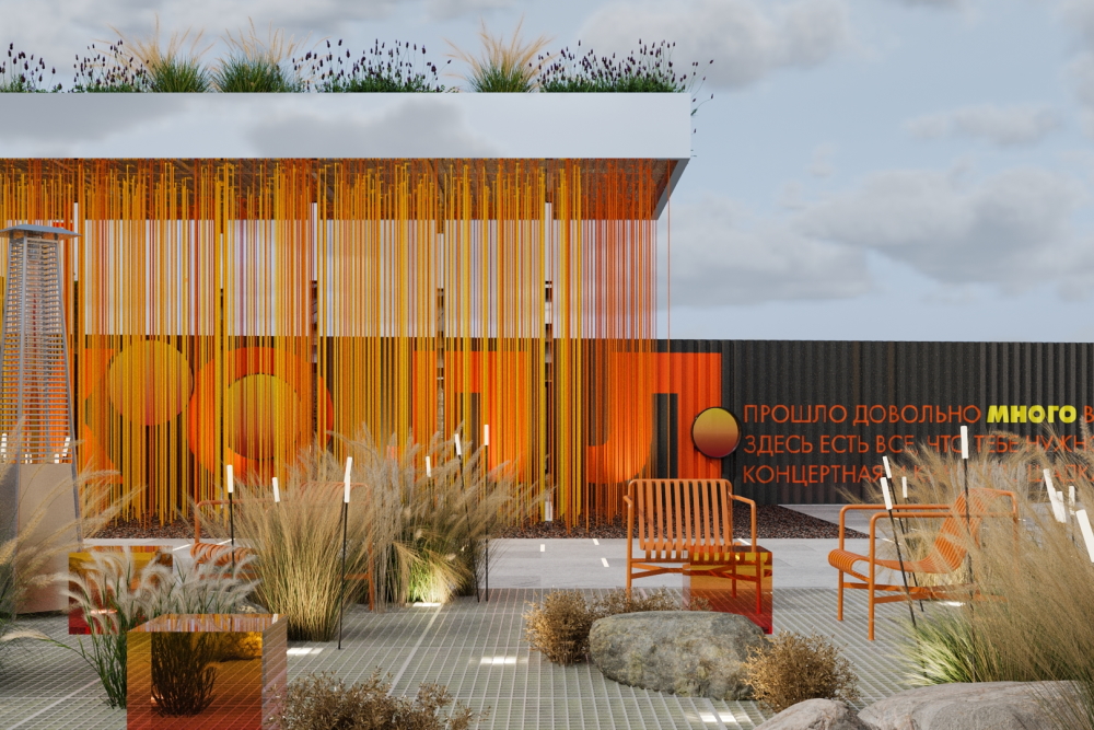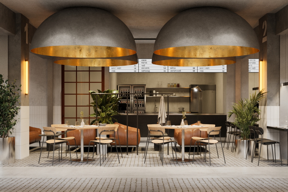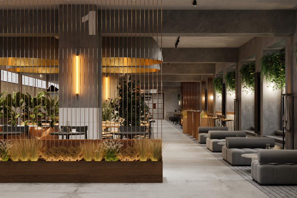 Прогулочную зону украсят арт-объектами, верандами, качелями и островками круглогодичных растений. Фуд-холл внутри здания рассчитан на 178 посадочных мест, его поделят на несколько зон. Например, в одной части установят диваны, а в другой — контактный бар. Часть мебели сделают из переработанного пластика, а у входа выставят стену из лоскутов экокожи с производства бренда Arny Praht.