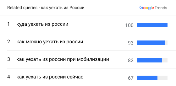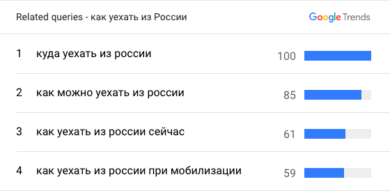 С 15 по 21 сентября россияне чаще всего спрашивали Google о популярных маршрутах и направлениях из страны, а также о возможности уехать из России во время мобилизации. В топ популярных запросов также вошла информация о Казахстане, Грузии, получении загранпаспортов и способах избежать мобилизации.