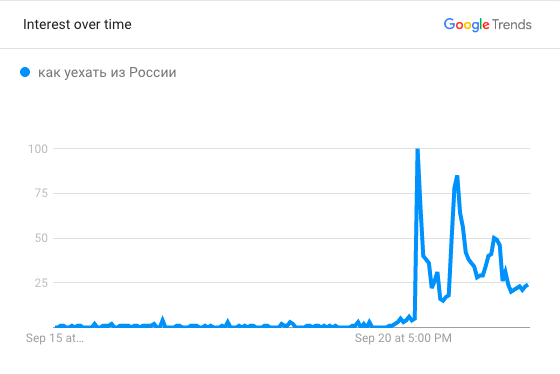 Накануне объявления президентом России Владимиром Путиным старта частичной мобилизации поисковые запросы россиян о том, как уехать из страны, резко увеличились. Пик популярности пришелся на заседание Госдумы 20 сентября, во время которого депутаты ужесточили наказания за правонарушения во время мобилизации. Еще раз популярность вопроса возросла в обед 21 сентября — после речи Путина.