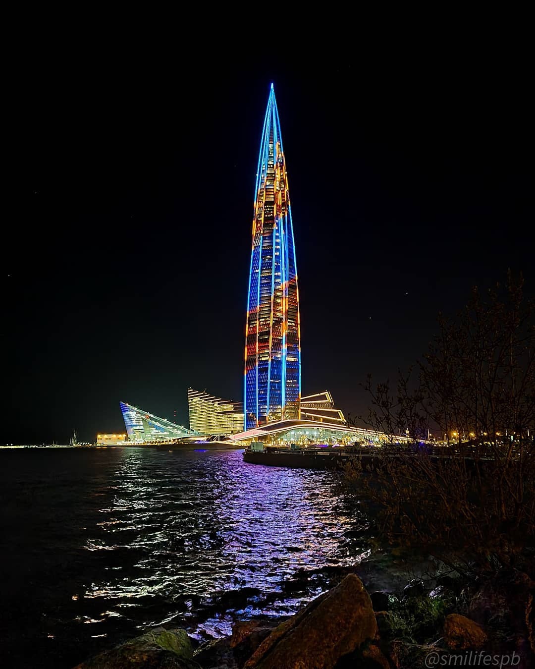 Накануне 9 мая на «Лахта Центре» включили подсветку в цвет георгиевской ленточки.