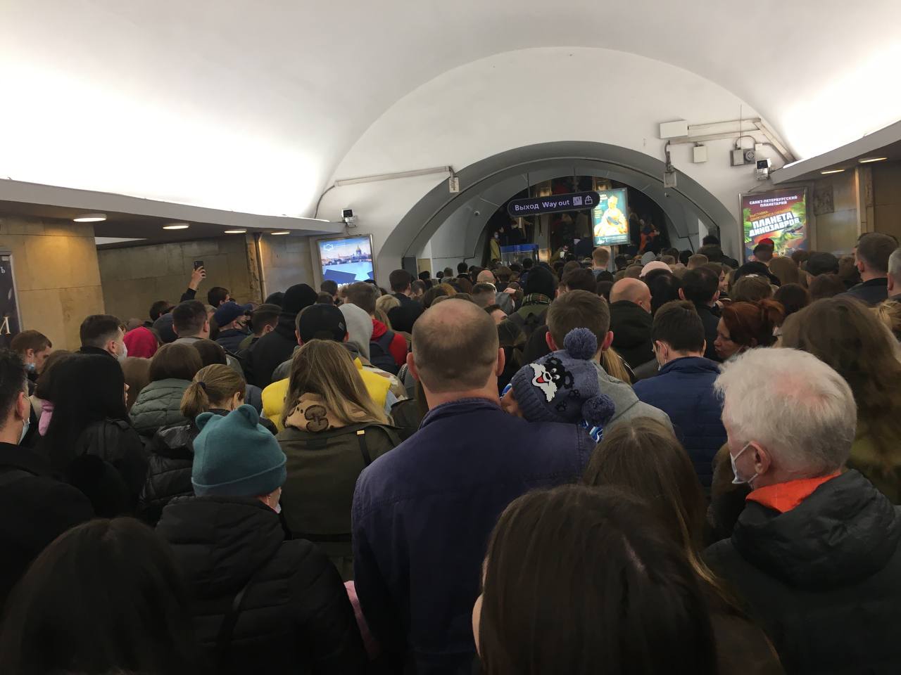 Из-за большого числа желающих покинуть центр в 12 часов вестибюль станции «Невский проспект» на канале Грибоедова частично закрыли на вход.