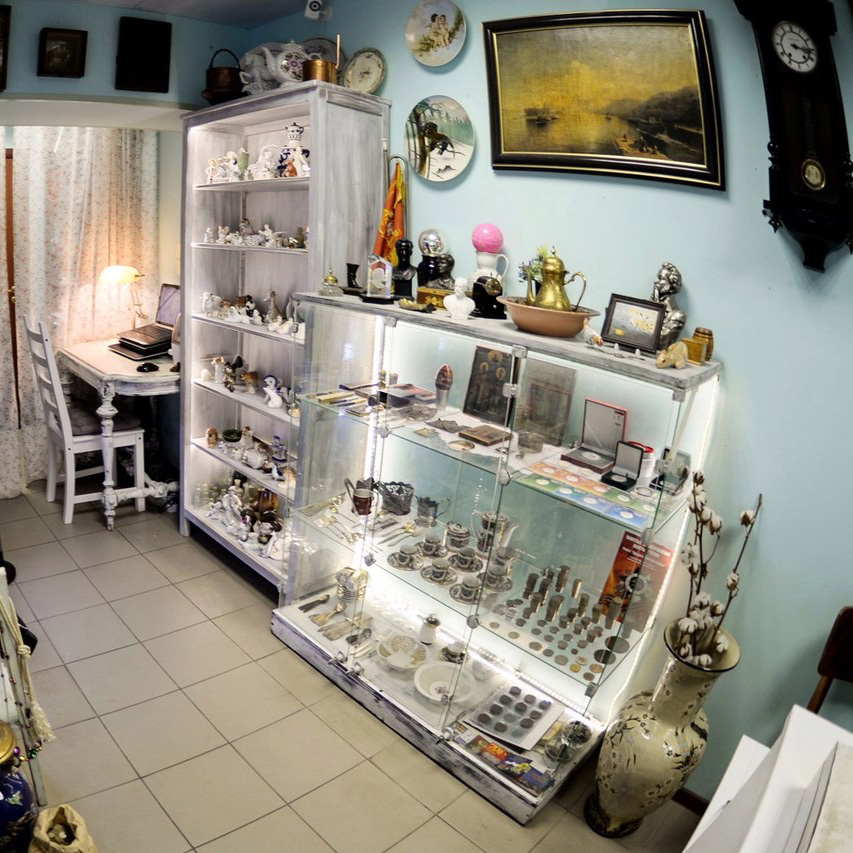 В магазине на 6-й линии Васильевского острова продают маленькие фарфоровые фигурки, чайные сервизы, ювелирные изделия, скульптуры из слоновой кости, старинные кофемолки, самовары и пресс-папье, а также юбилейные монеты и музыкальные инструменты. Магазину также можно продать разные предметы старины: для этого к потенциальным продавцам бесплатно выезжает оценщик.