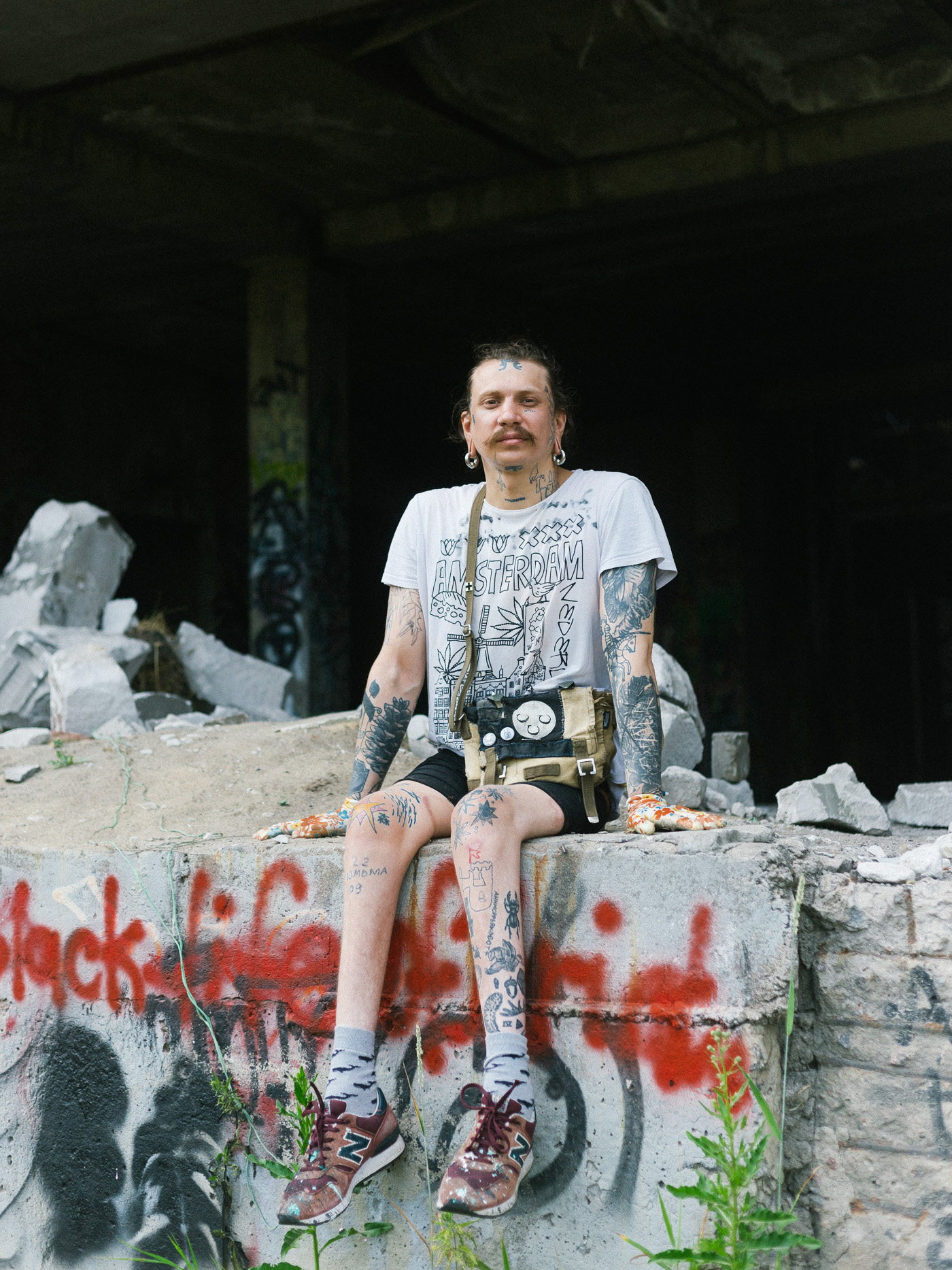 — Мне 32 года. Я бью татуировки, занимаюсь стрит-артом и организую уличные выставки. А еще заканчиваю 11 класс вечерней школы — у меня была очень веселая юность и не было времени. Я несколько раз пытался закончить школу, и каждый раз меня выгоняли, потому что много пропускал и не учился. Сейчас дорос и доучиваюсь просто для галочки.