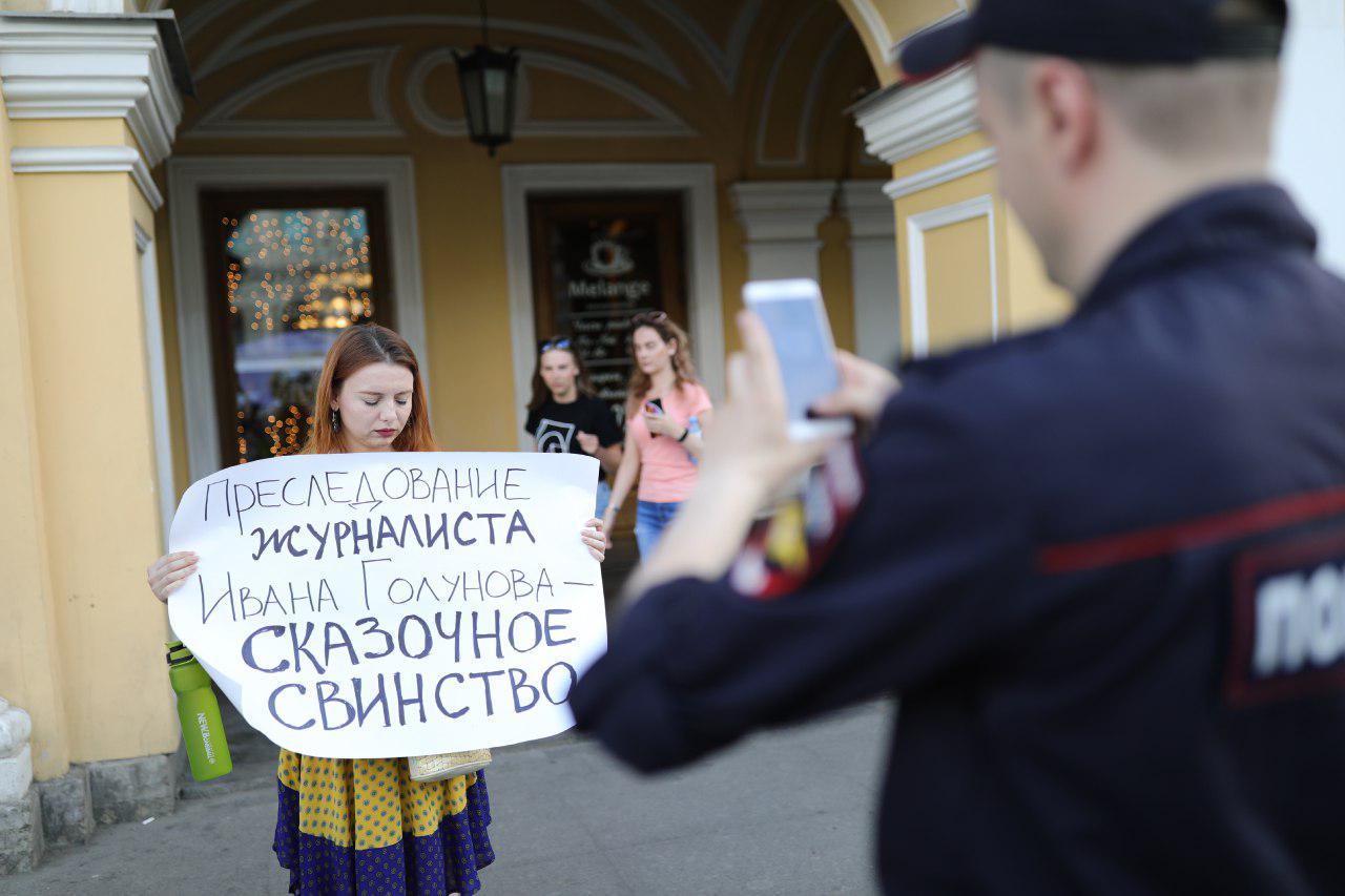 У Гостиного двора второй день проходят акции в поддержку обвиняемого в сбыте наркотиков журналиста «Медузы» Ивана Голунова. Петербуржцы стоят в одиночных пикетах с плакатами «Свободу Голунову» и «Сегодня дело против Ивана Голунова, завтра дело против вас».
