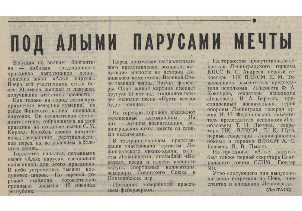 «Бумага» проследила, как за время существования «Алых парусов» в городской прессе менялось отношение к празднику. Повторяющиеся из года в год заголовки, отказ от казенного перечисления партийных функционеров и не самые оригинальные репортажи с обновленного праздника — в заметках советских и российских газет.