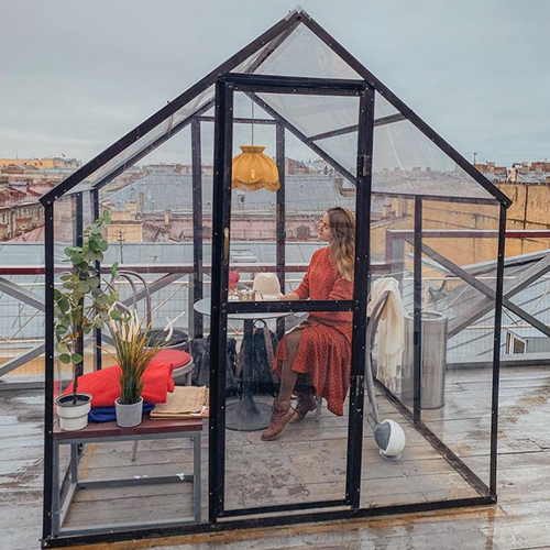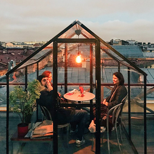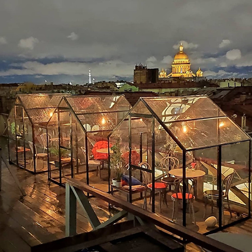 В конце ноября бар «Небо и вино» на крыше особняка в переулке Пирогова установил три прозрачных домика-террасы. Гости публикуют в социальных сетях свои фотографии, а телеграм-каналы окрестили площадку «террасой эпохи социальной дистанции».