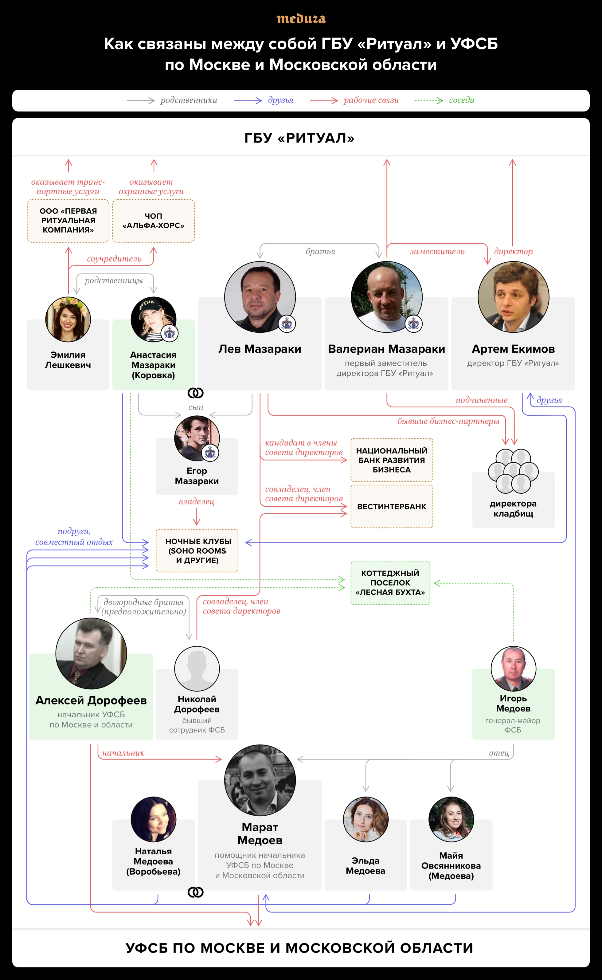 Сведения о том, что именно генерал Дорофеев стоял за назначением Артема Екимова главой московского ГБУ «Ритуал», подтвердил источник «Медузы» в правоохранительных органах. Офицер одной из спецслужб, лично знакомый с Маратом Медоевым, рассказал «Медузе», что Екимов считался «человеком Дорофеева».