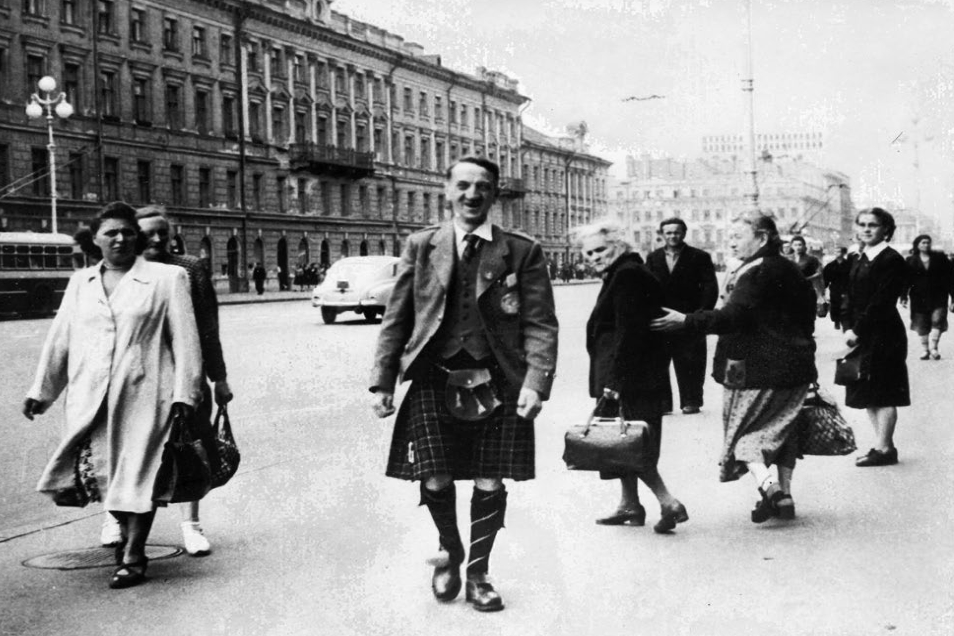 Журналист Джимми Свон в килте на Невском проспекте (1955). Из коллекции Ольги Хорошиловой