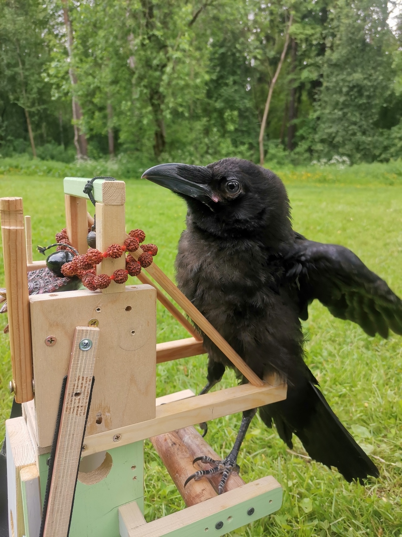 Теперь мы учим его летать. Инстинкты инстинктами, но учат этому родители. Однажды, когда мы гуляли в ветреную погоду, вороненок просто оттолкнулся, расправил крылья и пролетел несколько метров в потоках воздуха. С тех пор его рекорд полета — сорок метров.