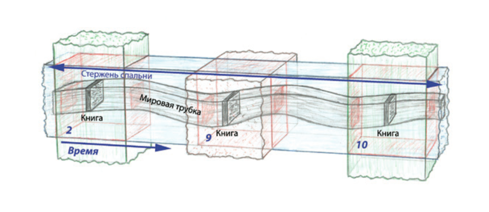 Рис. 30.2. Мировая трубка книги в стержне спальни Мерф. Книга и мировая трубка на рисунке гораздо больше, чем должны быть в действительности (Мой набросок от руки.)