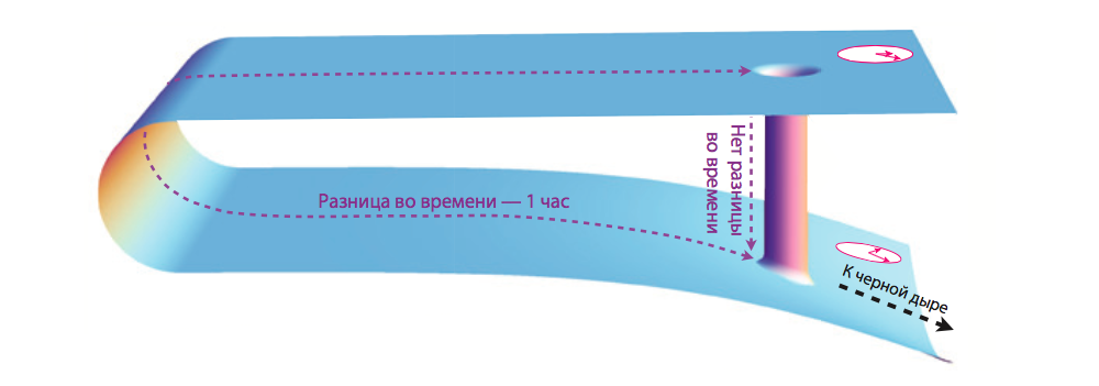Поскольку черная дыра обладает сильным гравитационным притяжением, эйнштейновский закон искривления времени утверждает, что у нижнего устья червоточины время течет медленнее, чем у верхнего. Медленнее — относительно пути интенсивного гравитационного притяжения, который проходит через внешнюю Вселенную (фиолетовый пунктир). Будем считать, что это дало отставание в один час, то есть если сравнить показания часов во внешней Вселенной, то часы у нижнего устья будут показывать на час меньше, чем часы у верхнего. и дальше это отставание будет расти.