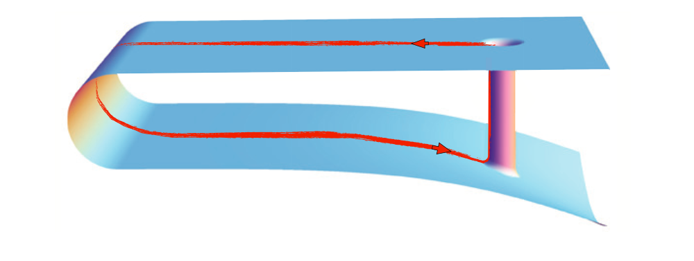 Если такое умозрительное расширение корректно, тогда в балке время ведет себя в целом так же, как и в нашей бране. В частности, объекты и сигналы в балке, так же как и в бране, могут двигаться в локально замеренном времени (локальном времени балка) лишь в одном направлении — от прошлого к будущему. Они не могут двигаться во времени назад, оставаясь в тех же пространственных координатах. Если в балке путешествие назад во времени допустимо, этого можно достичь, лишь перемещаясь в пространстве балка и вернувшись до начала путешествия, но при этом всегда двигаясь вперед в локальном времени балка. Это аналог путешествия туда-обратно на рис. 30.3 для балка.