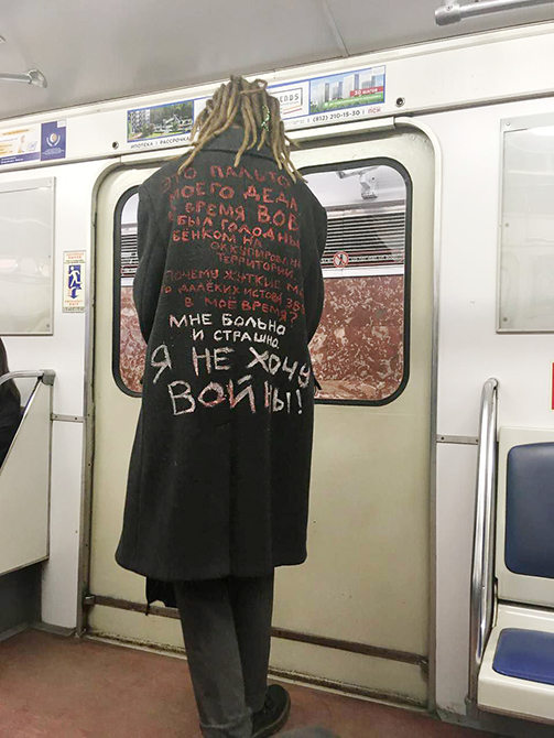В марте в петербургском метро заметили человека в необычном пальто с надписью: «Это пальто моего деда, во время ВОВ он был голодным ребенком на оккупированной территории. <…> Я не хочу войны». Его фото опубликовали в телеграм-канале «Северное техно».