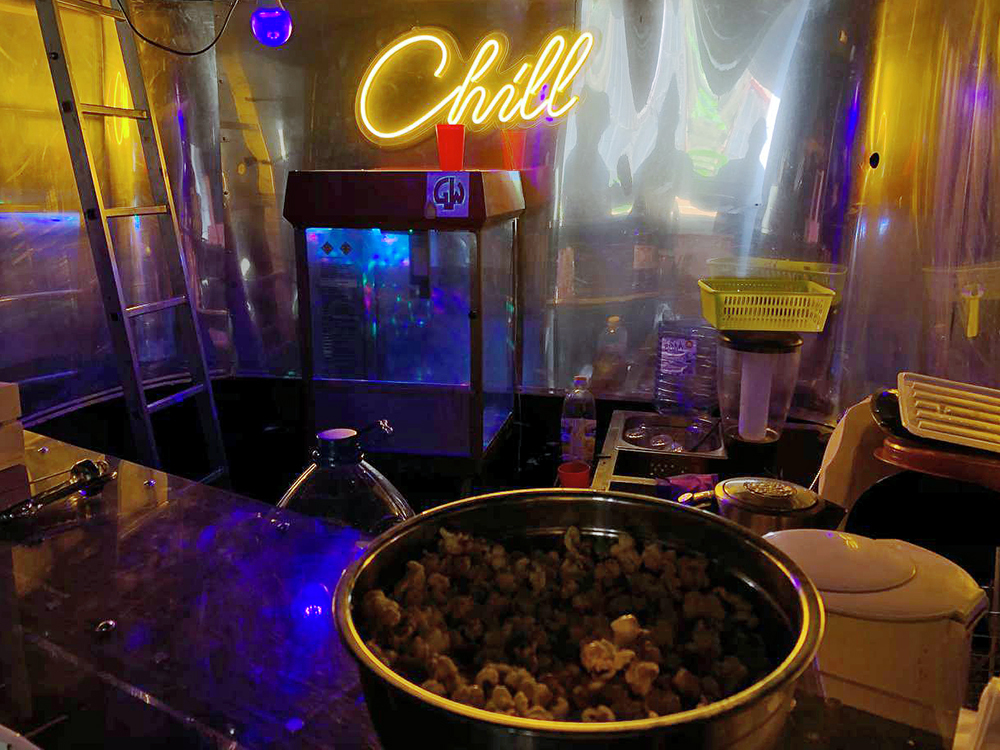 За год посетителей в салоне заметно прибавилось и пространство потребовалось расширять: над мягким диваном появилась еще одна зона для зрителей — с пуфами и моноклем, а в соседнем помещении — барная стойка с аппаратом для приготовления попкорна. С недавнего времени к каждому показу его организаторы также создают оригинальные афиши: Аргентина рисует, а Артем собирает коллажи. После блокировки инстаграма и фейсбука в России у видеосалона появилась вывеска.